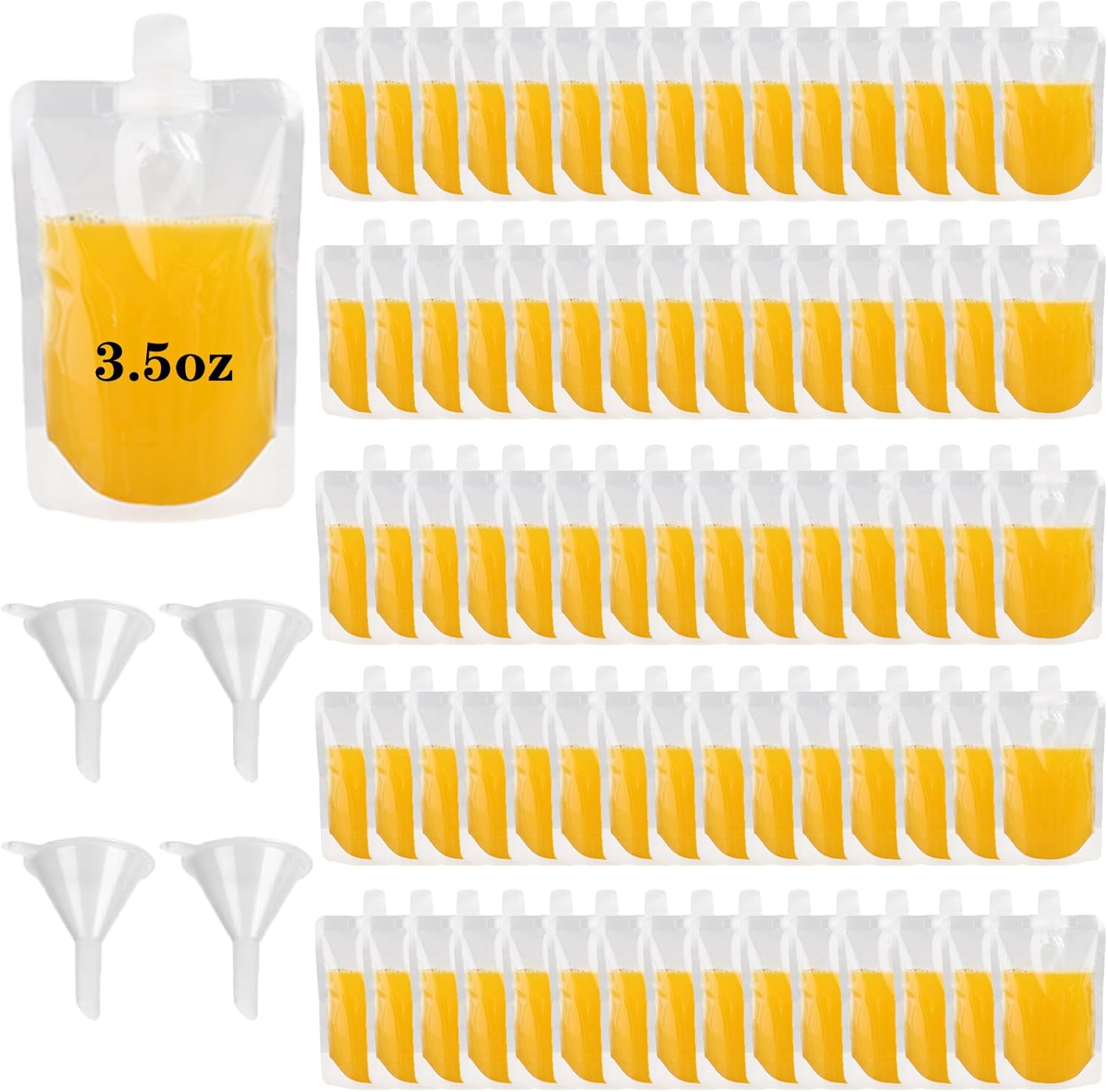 120 Pcs Plastic Flasks,3.5 Oz Drink Reusable Plastic Pouches Leak-Proof Juice Pouches Bags with 4 Funnels for Travel Outdoor Sports, Concerts, Events