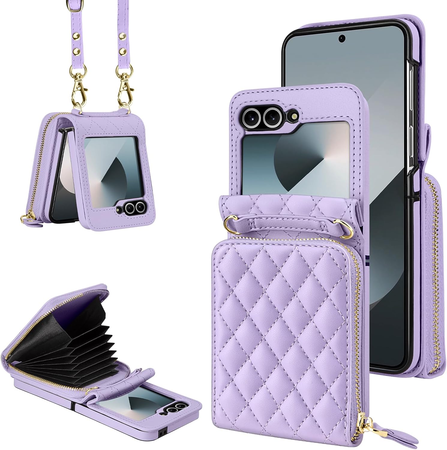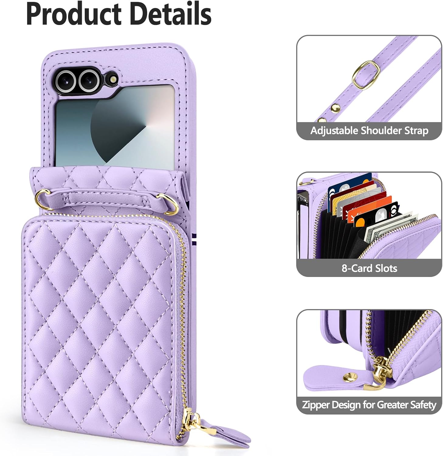 Vofolen for Samsung Galaxy Z Flip 6 Case with Card Holder Crossbody 8-Card Slots Wallet Case with Adjustable Strap Soft PU Leather Protective Zipper Flip 6 Phone Case for Women Girls, 6.7'' Purple