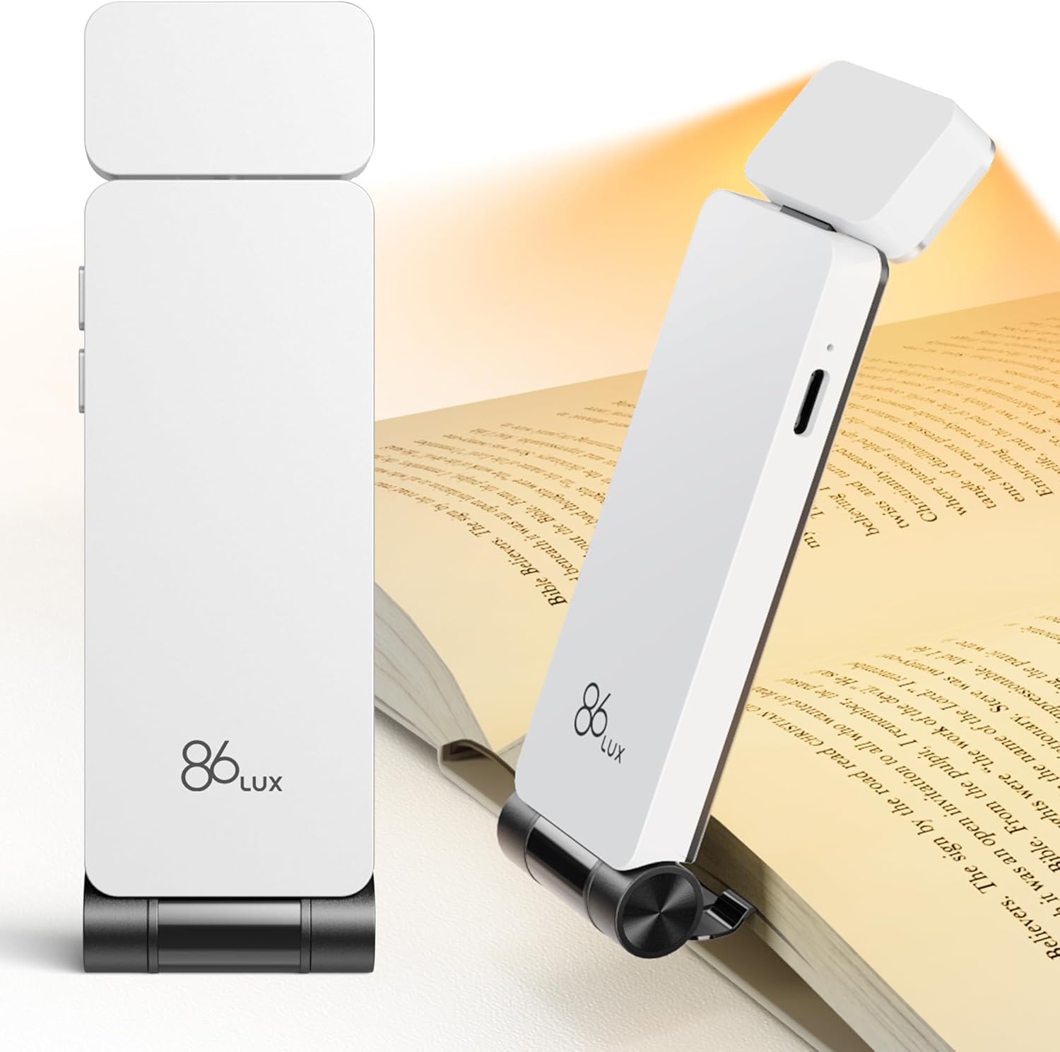 86lux Book Light, Rechargeable Reading Lights for Books in Bed, Ultralight Clip-on LED Bookmark Lamp with 3 Amber Colors & Stepless Dimming for Night Reading for Book Lovers, Kids, White