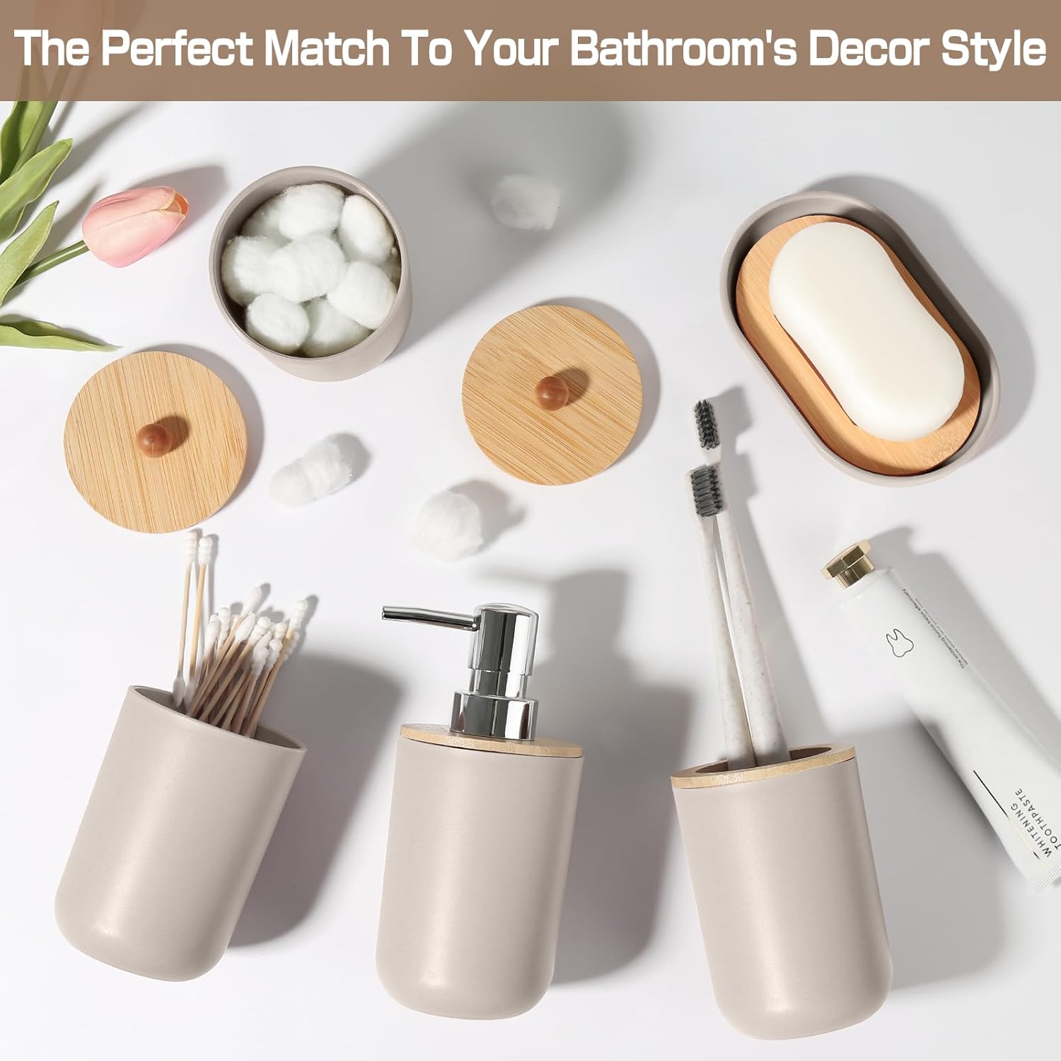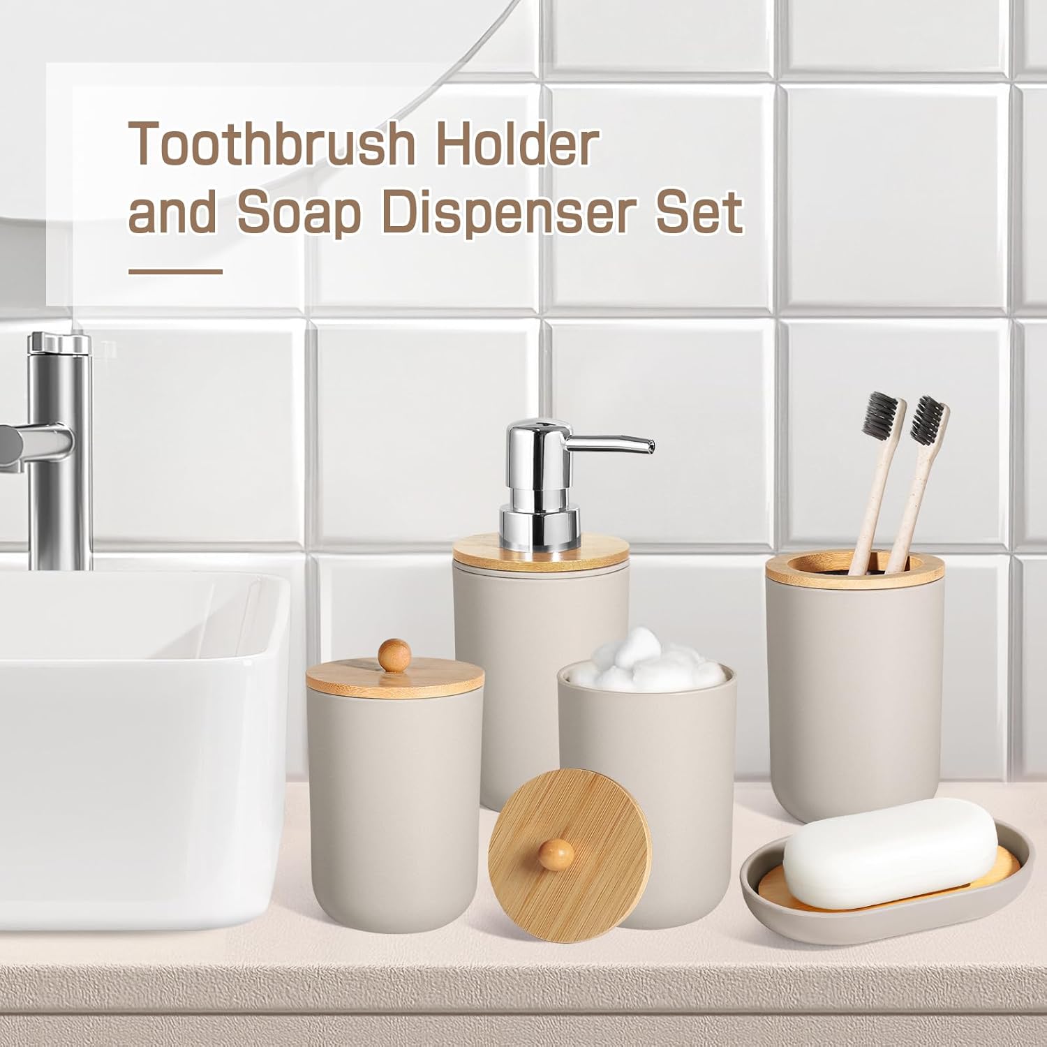 Bathroom Accessories Set 5 Pcs, Plastic Beige Bathroom Decor, Soap Dispenser and Toothbrush Holder Set, Soap Dish, Cotton Swab Jar, Bathroom Set, Boho Bathroom Organizer Accessory