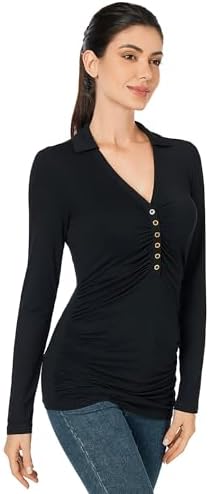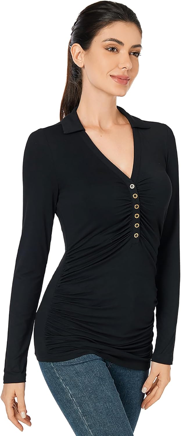 AmélieBoutik Women Casual Long Sleeve Button Collar Deep V Neck Ruched Slim-Fit Top