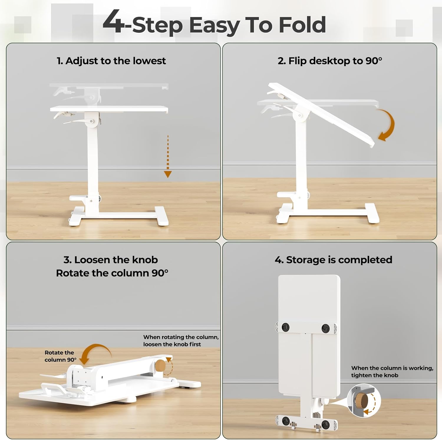 Foldable Mobile Standing Desk, 27 Inch Small Rolling Laptop Cart Height Adjustment, 90° Tiltable Bedside Table, No Assembly Needed Portable Computer Workstation, White