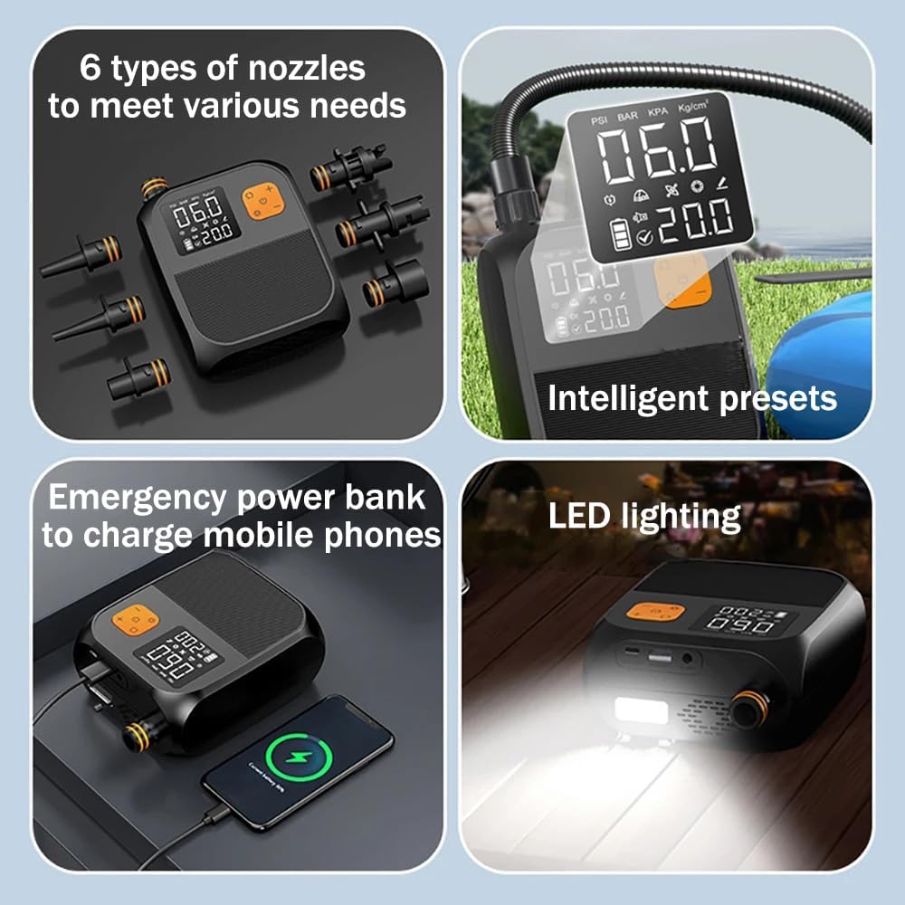 MULTIFUNCTIONAL: The electric air pump with LED display, flashlight illumination and SOS rescue feature features a large backlit LCD display that not only shows you the target pressure, but also allows you to monitor the inflation process in real time. The flashlight facilitates nighttime inflation and deflation operations.SOS rescue function in case of emergency without panic.