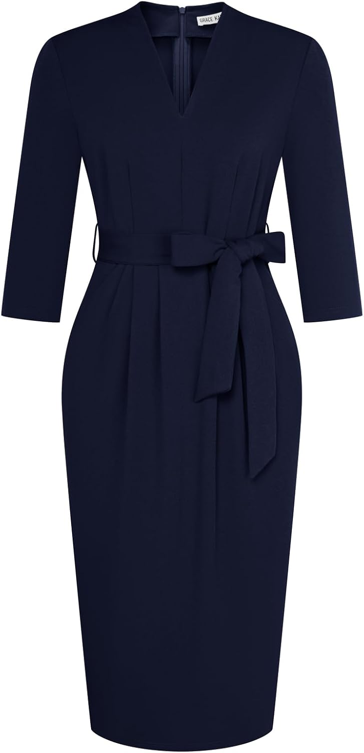 GRACE KARIN Womens Work Dresses V Neck 3/4 Sleeve Back Zipper Tie Waist Bodycon Dress Office Cocktail Dress with Pockets