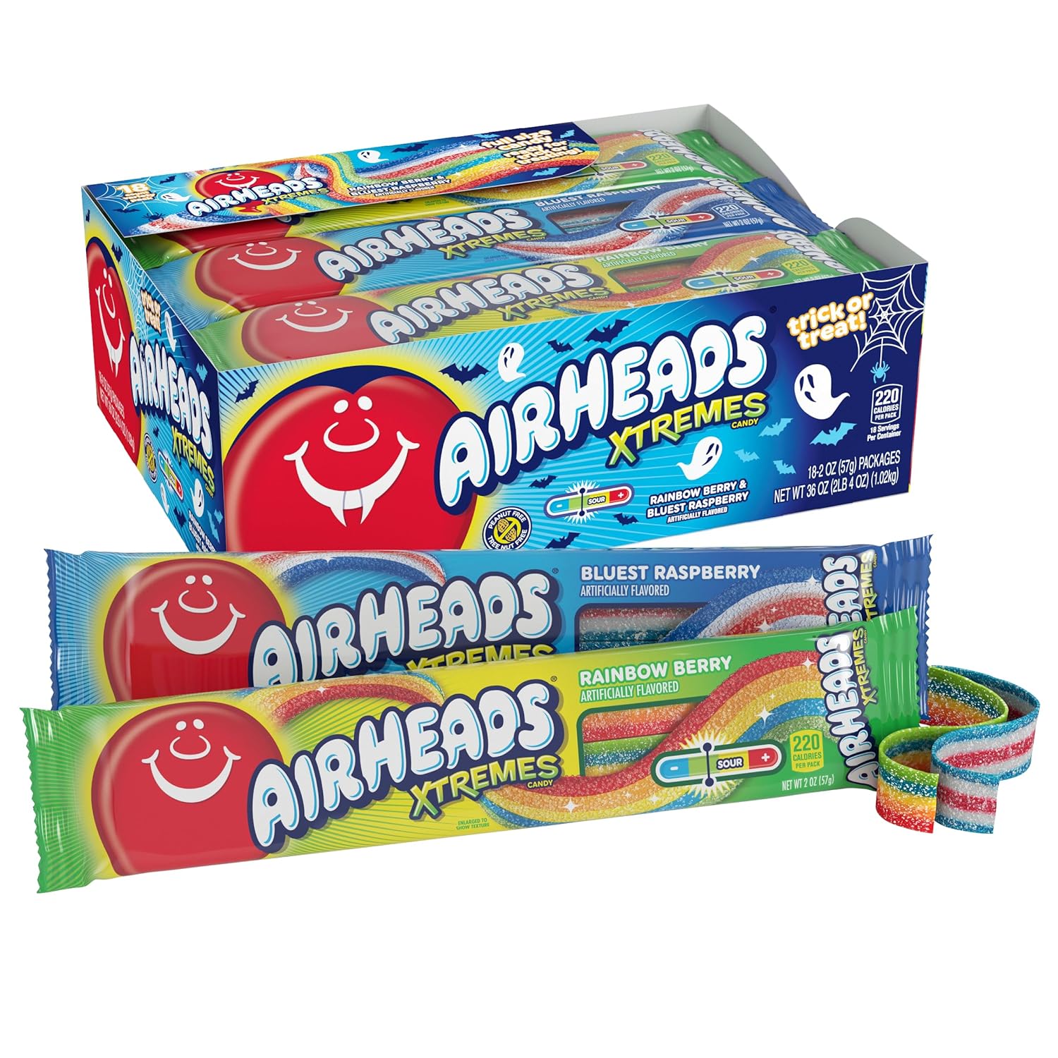 Airheads Xtremes Belts, Halloween Trick or Treat Pack, Rainbow Berry and Bluest Raspberry Flavors, Assorted Multipack, 2oz (Pack of 18)