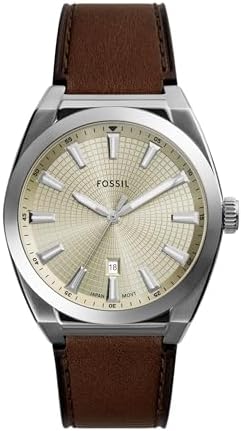 The Everett Fossil men’s watch features a sleek dial, three-hand date movement, and a durable bracelet. Sporty yet sleek, its design is inspired by vintage roadsters with smooth curves and chrome details. Built with a scratch-resistant mineral crystal lens, this men’s watch is made to last. The contoured case, textured dial, and lume hour markers highlight its quality craftsmanship. The bracelet is also adjustable for a custom fit, making Everett a standout in Fossil watches for men.