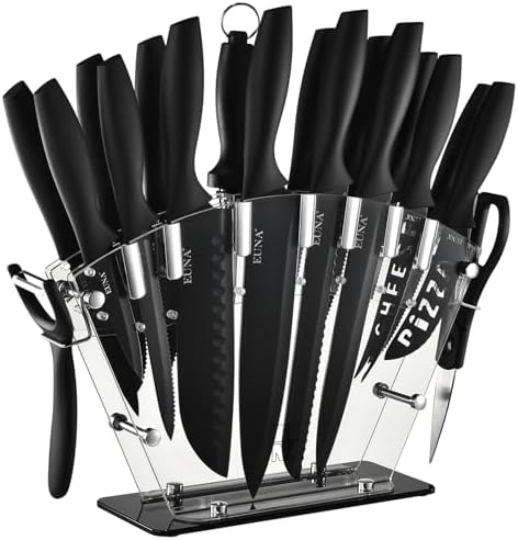 EUNA Kitchen Knife Set, 19 PCS Black Knife Set with Acrylic Block and Sharpener, German High-Carbon Stainless Steel Knife Sets with 6 Serrated Steak Knives, Bread Knife, Chef Knife, Dishwasher Safe