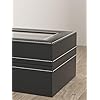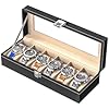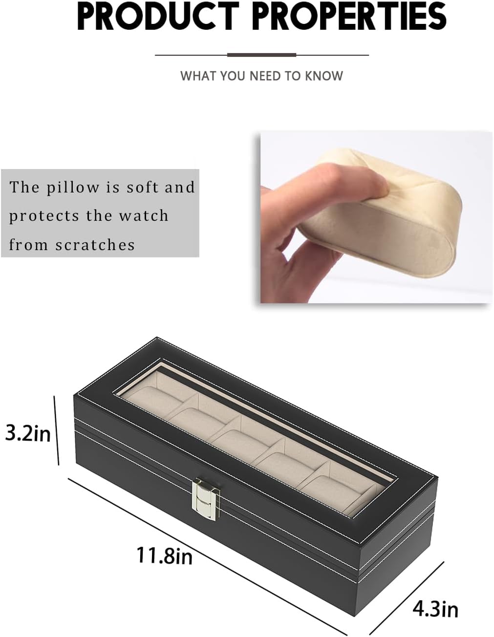 This watch box has a large clear glass lid that allows you to find the right watch at a glance. Each compartment has enough room for most different types of watches and is durable and easy to clean!