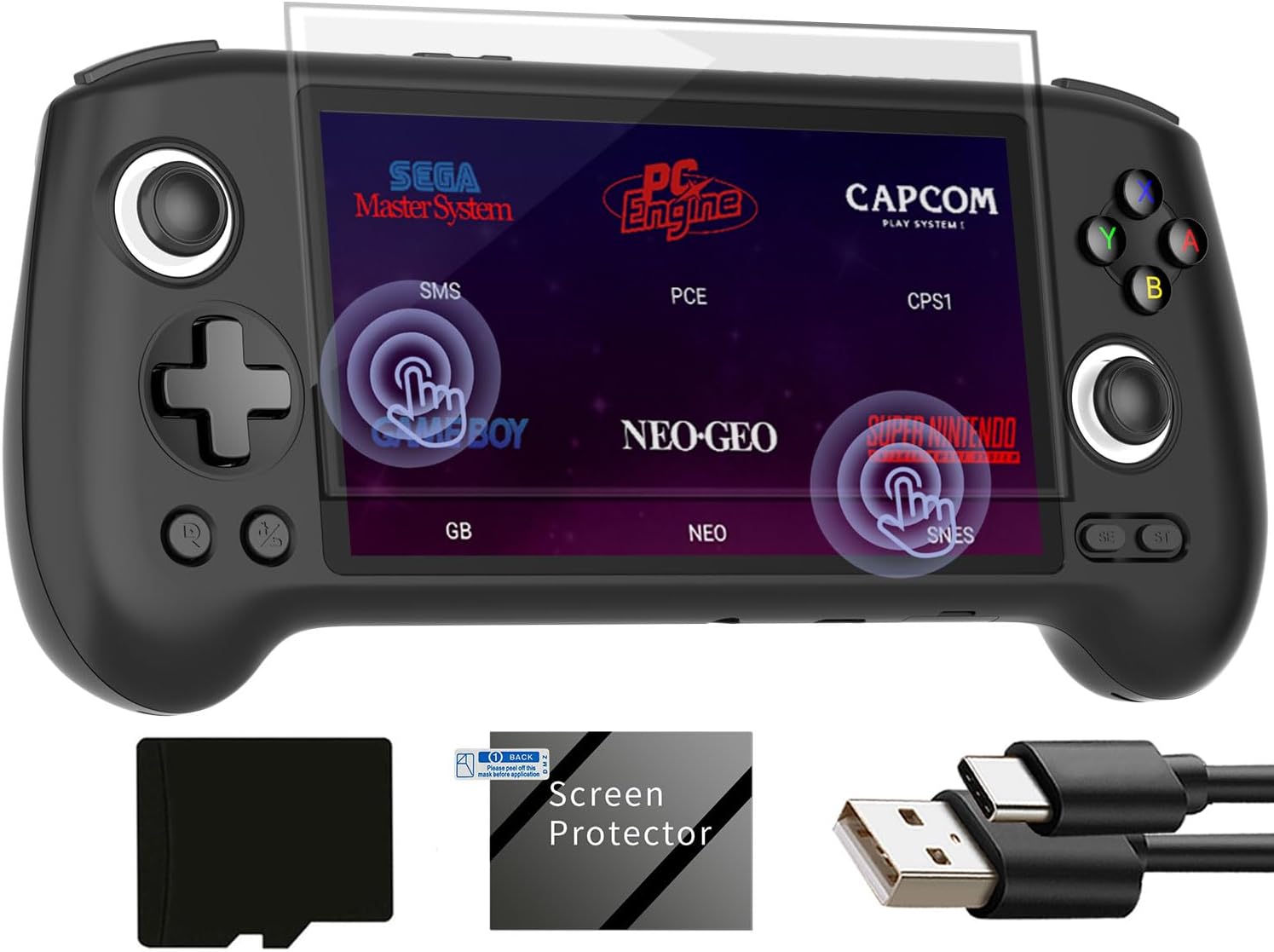 4.【rg 556 with 128G TF Card Pre-Loaded 4423 Games is a ideal gift】rg556 supports dozens of emulators, comes with gamefront-end and key mapping.rg556 retro handheld game official system is continuously maintained and updated, and supportsFOTA system upqrades.Dimensions of RG556 Handled game :22.3cm*9cm *1.5cm,lt is ergonomic design, buttons feel goodand comfortable to hold is a great gift for boyfriend, husband, brother, son, father and friends for birthday, Father's Day,Christmas