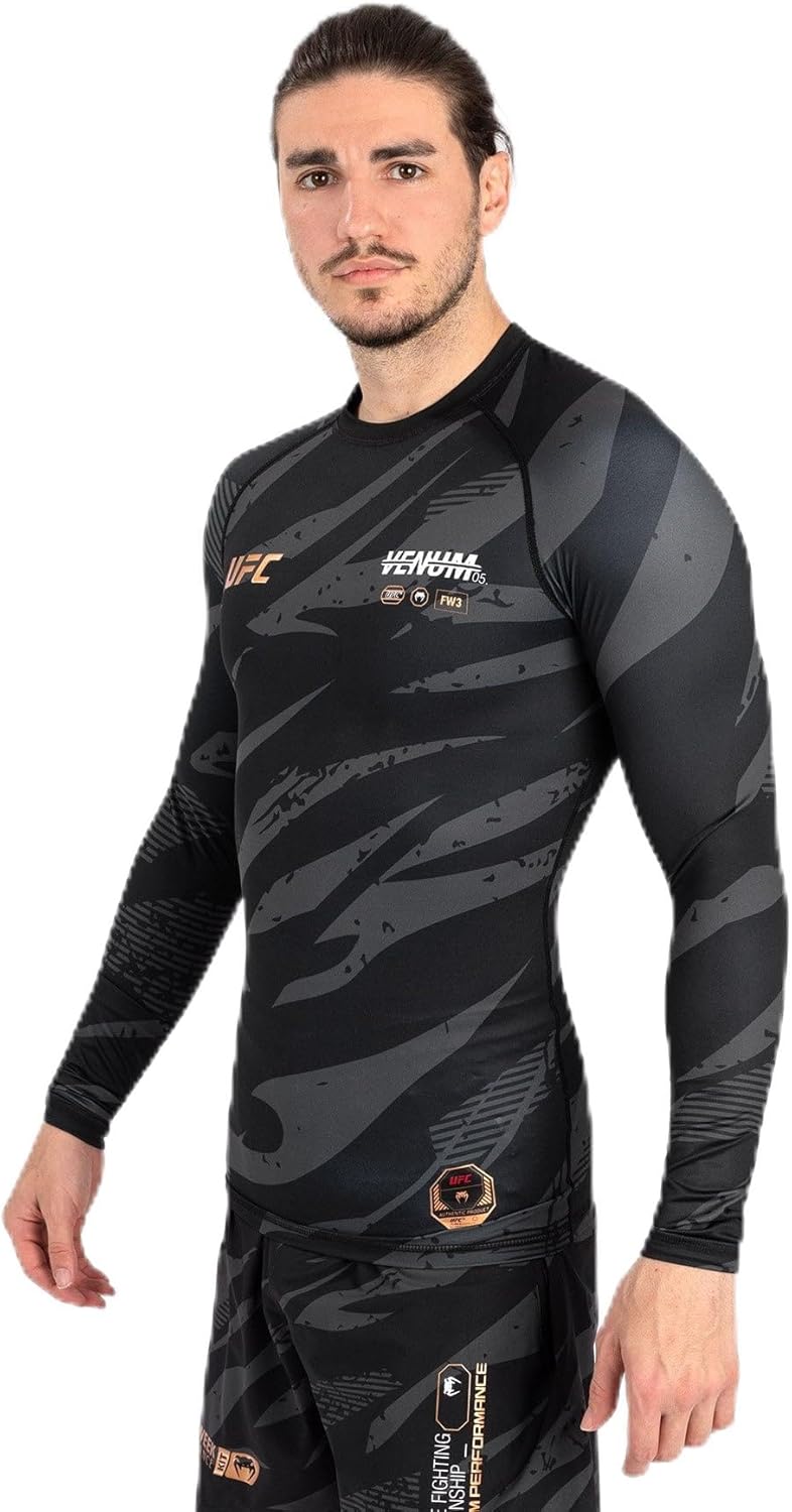 This Long Sleeve men’s rashguard is part of the latest high-octane collection from Venum and the UFC. The UFC Adrenaline by Venum collection features hardworking performance fabrics and thoughtful detailing, to keep pace with competing UFC athletes during Fight Week and through Fight Night. UFC Adrenaline by Venum Men’s Fight Week Performance Long Sleeve Rashguard serves as a second skin to provide protection against injury and freedom of movement during grappling. The rashguard’s compression technology also helps encourage muscular recovery.Its bold camouflage print, with its bronze and white Venum and UFC logo detailing, is inspired by athletes who step into the Octagon, ready to strike and counter strike. This rashguard matches perfectly with the men’s performance tights and other products from the same collection.