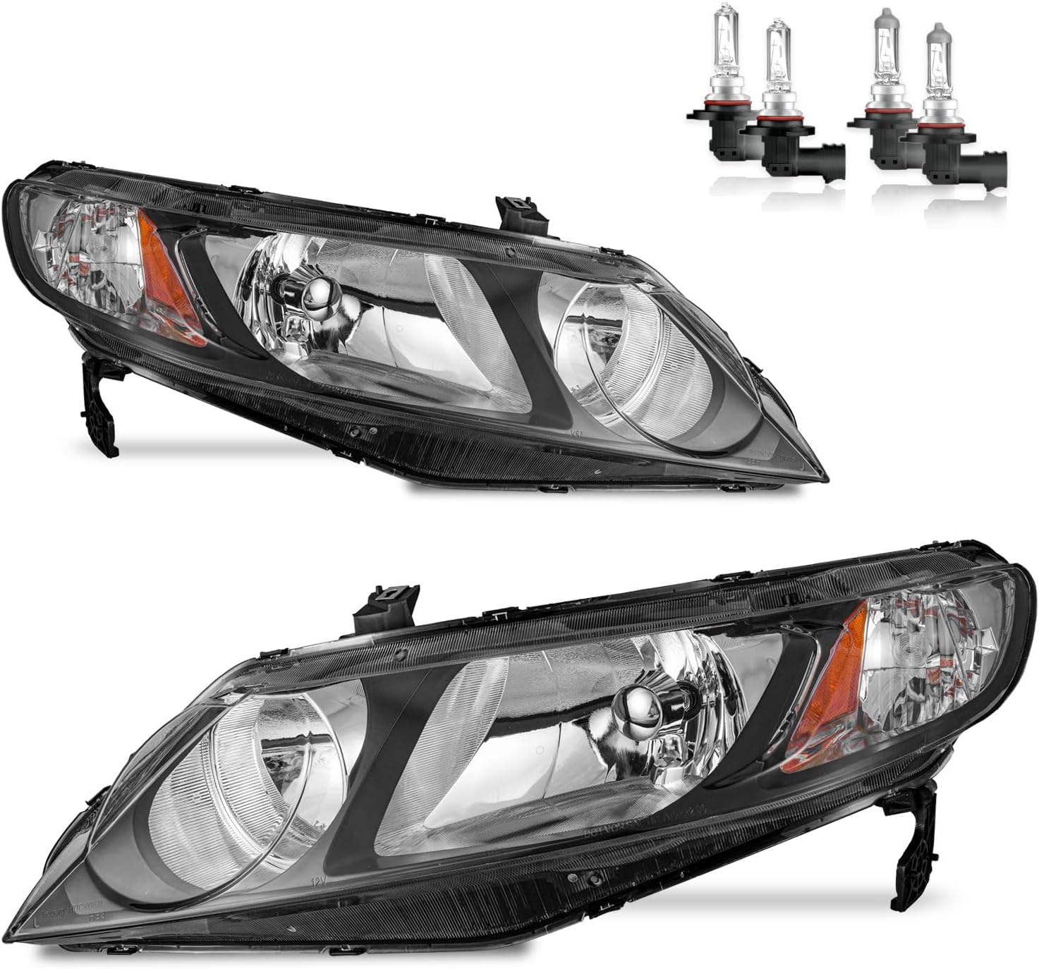Headlights Assembly for 2006-2011 Honda Civic 4-Door Headlamp Replacement Black Housing Amber Reflector Driver & Passenger Side (NOT fit 2-Door)