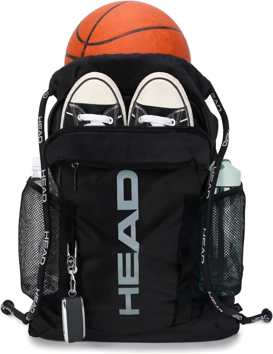 ⭐【Thickened Gym Drawstring Backpack】HEAD sports draw string backpack is made of thickened polyester material, which is soft and comfortable, lightweight, strong load-bearing, wear-resistant, durable, folded and not easy to wrinkle. The drawstring of the cinch bag is high-quality and thickened to prevent it from sinking into your shoulders, which helps to reduce the burden on your shoulders, making it more comfortable to use and extending the service life of the basketball drawstring backpack.
