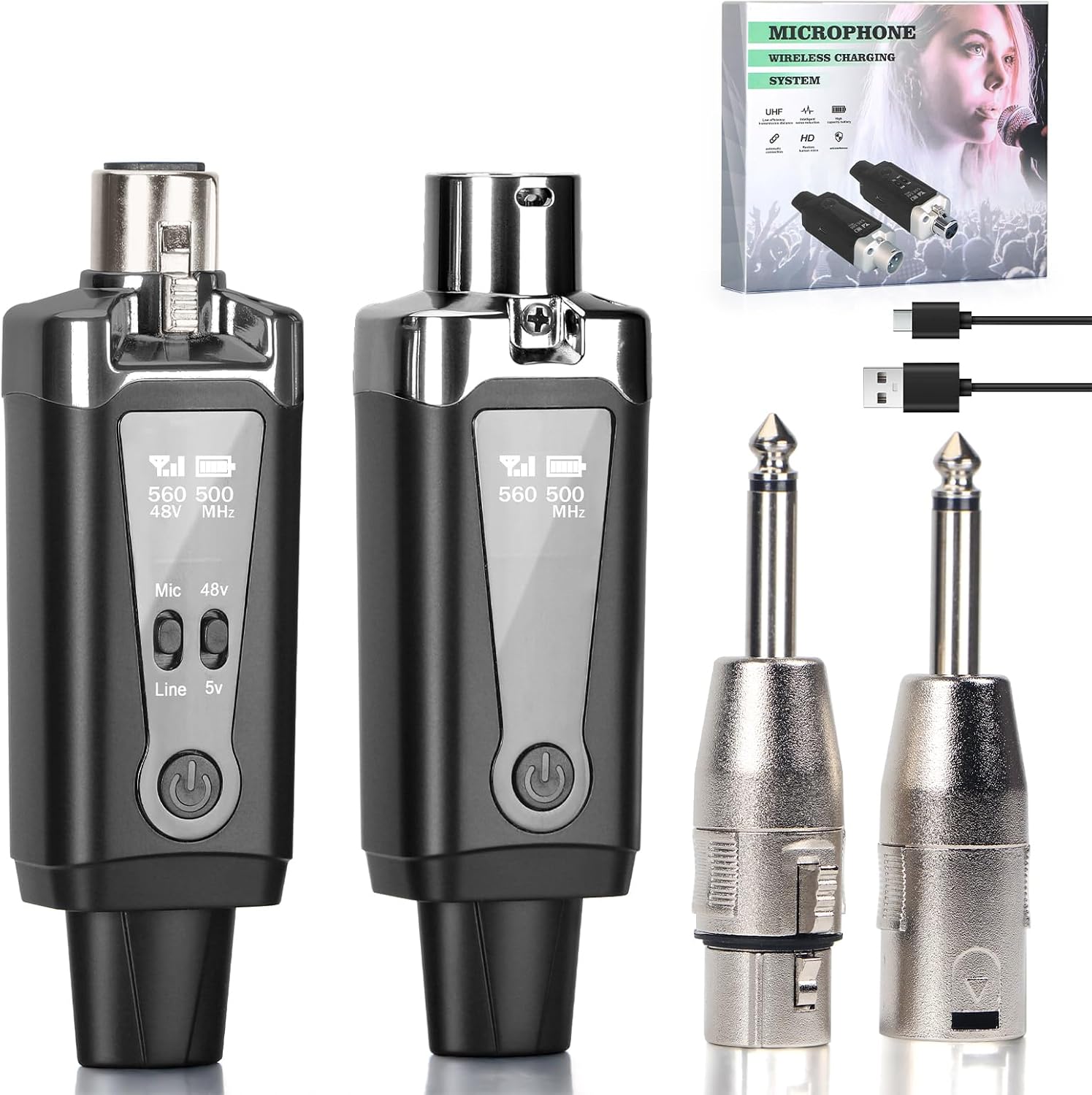 Support Multiple Devices: Both the receiver and transmitter come with XLR plugs and an included XLR to 6.35mm adapter.The XLR interface can be adapted to hybrid mixing consoles, amplifiers, speakers, etc., while the 6.35mm 1/4" interface can be used for electric guitars, pianos, bass, etc. It also supports both 48V and 5V modes, which can be widely used in different usage scenarios such as live performances, venues, weddings, speech, party, vocal concert, band rehearsal, etc.