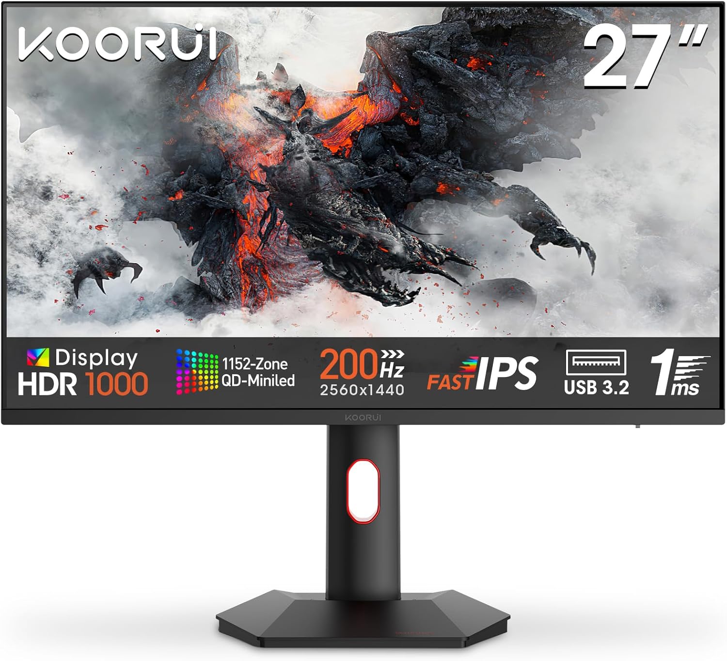 KOORUI Monitor, 27” 1ms 200Hz Gaming Monitor, Mini-LED Panel- 1440P WQHD 300000:1 Contrast Ratio Computer Screen, HDR 1000 Display, 97% DCI-P3, Tilt Adjustable, HDMI/DP, Eye Care