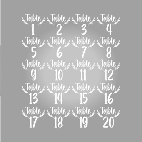 ✓ Our high quality vinyl decal Seating Chart Table Numbers 1-20 adhesive design ranges from 5 inches by 4.5 inches each. Each custom set comes with table numbers 1-20. The pictures are for display and inspiration only. All of our vinyl wall decals are manufactured with premium industrial grade Lutema self-adhesive vinyls.