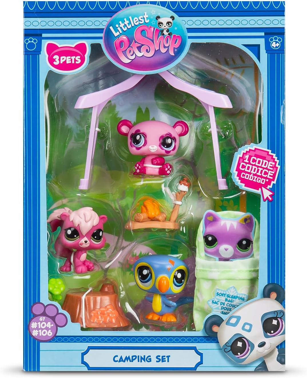 LITTLEST PET SHOP CAMPING THEME - Start your camping adventures with 3 adorable animals, including #104 Panda, #105 Toucan, and #106 Squirrel. Each figure stands approximately 5 cm tall and has an adorably cute dodeline head.