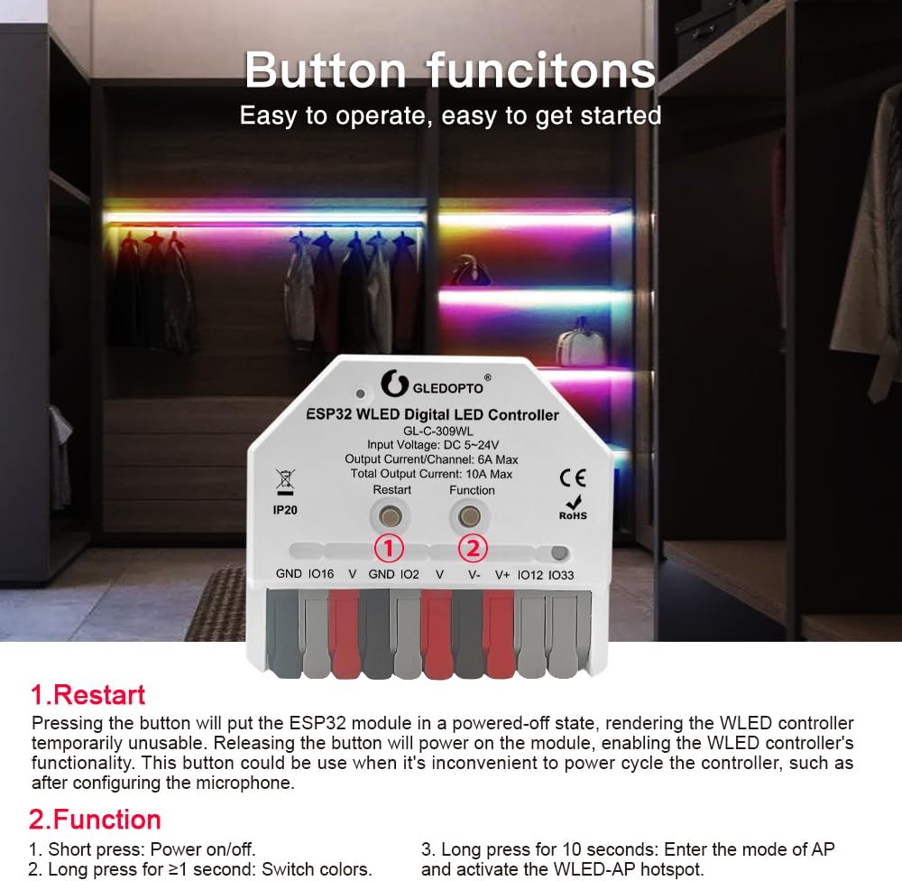 WiFi Wireless Control: The ESP32 WLED light strip controller can be connected through WiFi and controlled directly using the WLED app, without the need for an additional gateway device. This means you can control your light strip anytime, anywhere using your smartphone or tablet, making it convenient and easy