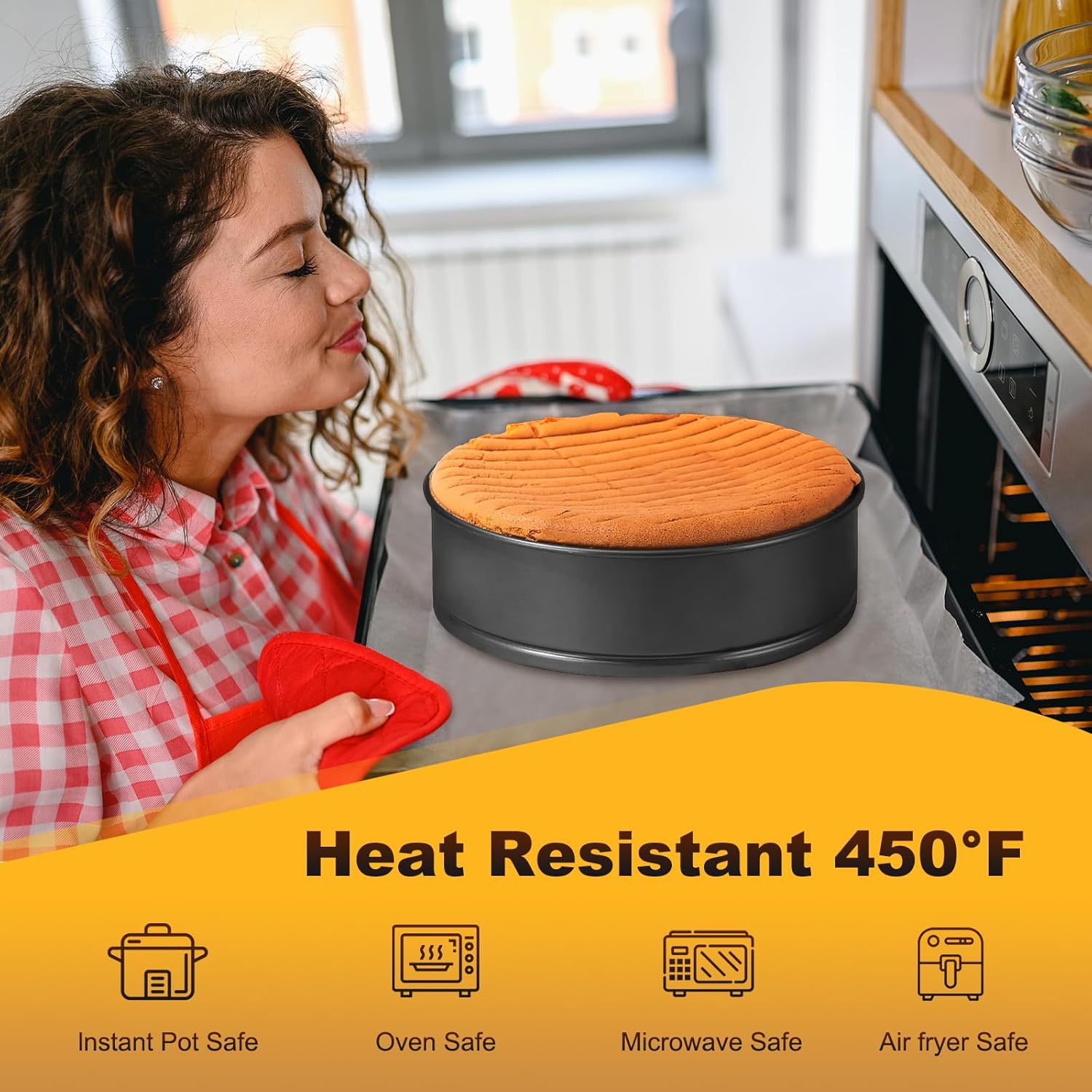 HIGH TEMPERATURE RESISTANT DESIGN: The cake pan mold's high temperature resistance allows it to withstand temperatures up to 450°F and is suitable for use in pressure cookers, air fryers, microwave ovens and ovens. The effectiveness of carbon steel material to dissipate heat evenly ensures that you can bake a variety of delicacies, such as cheesecake, pizza, quiche, ice cream cake, lasagna and so on.