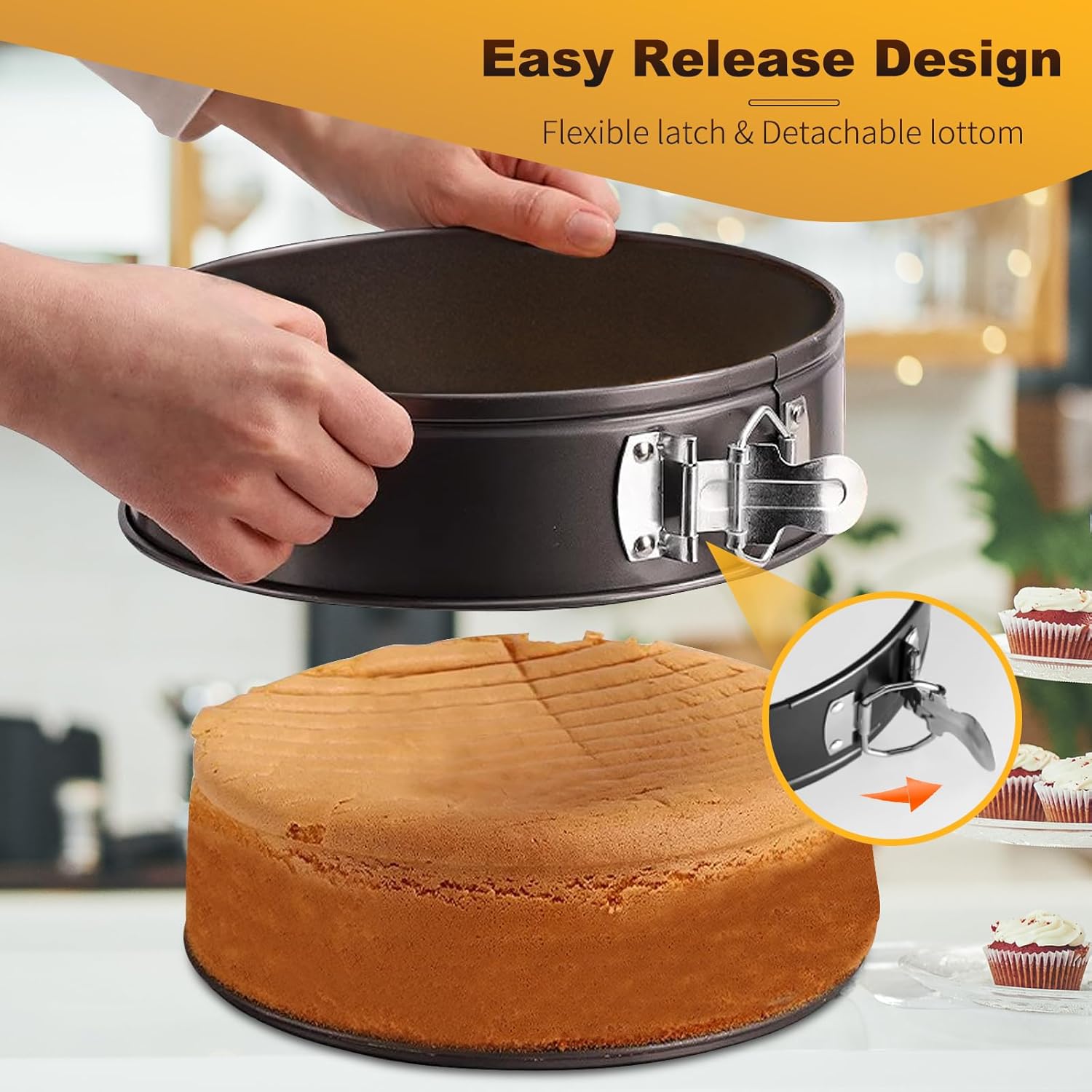 MADE OF PREMIUM QUALITY MATERIAL: This set of springform cake pan molds is made of high quality high carbon steel material, sturdy and durable. The surface of the cake pan has a double-layer non-stick coating, which ensures that the cake comes out of the mold easily and reduces sticking during baking.