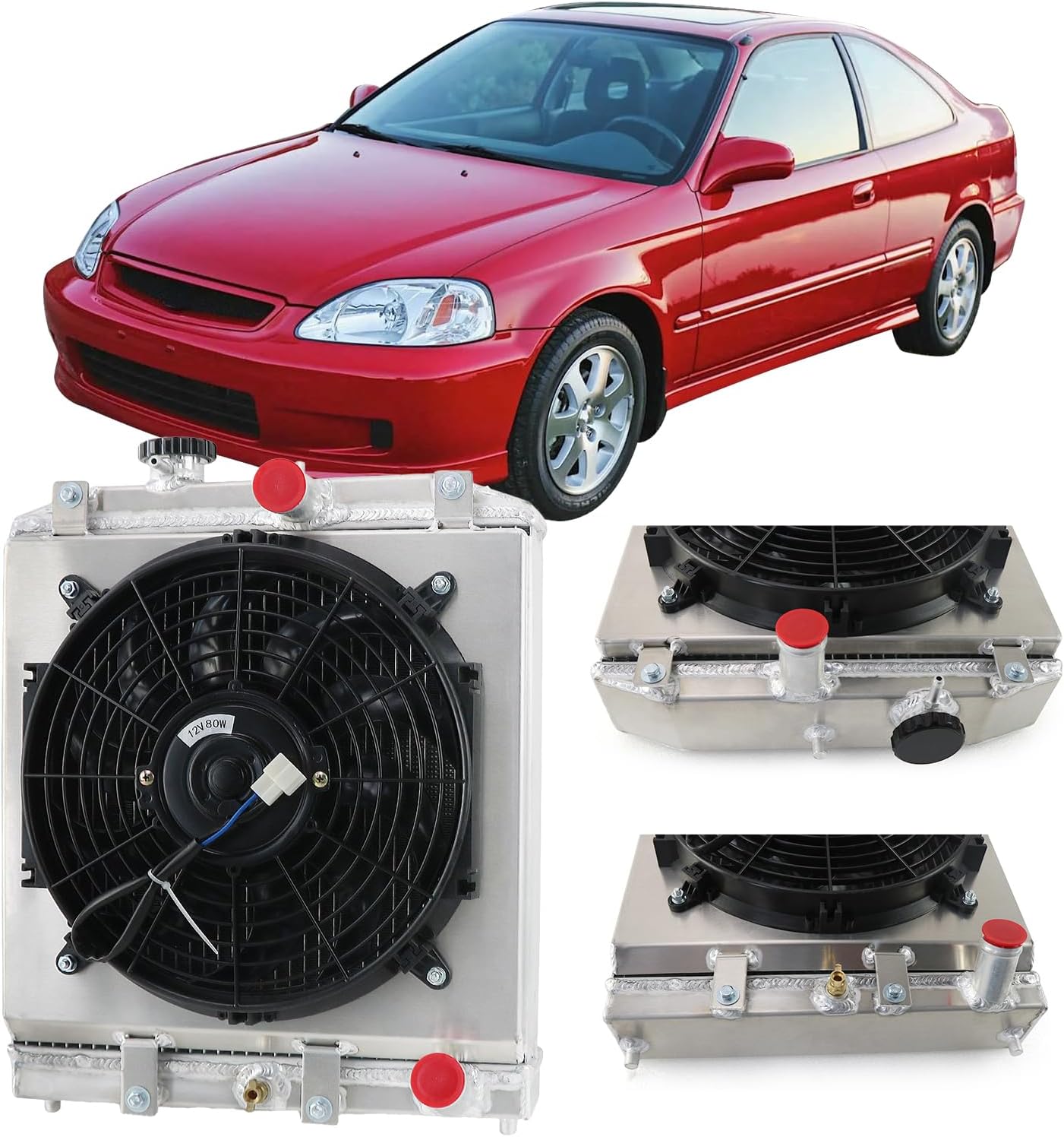 This Radiator Fits For Honda Civic D15 D16 EK EG 1992-2000 For Honda Civic EK EG 1992-2000 DEL SOL 1993-1997 For Honda Acura Integra GS LS HX L4 L6 1992-2001This Listing Is Including1 X 4-Row Aluminum Radiator (Includes Radiator Cap) 1 X Aluminum Shroud 1 X 12" Fan (Includes mounting kits) 1 X Thermostat Relay Kit Radiator Details Core Row: 4 Row Core Material: Full Aluminum Tank Material: Full Aluminum Radiator Cap: Included Radiator Flow: Down Flow Mounting Style: Bolt-On Fitment Type: Direct Replacement The tanks are 100% welded by TIG CNC machined filler neck and cap OEM style brass petcock drain High Performance Racing Spec Part Number 02ARA8303ASL 17111728908 17111469179 17112241912 Q9676 RA 1290C REA411290A SPTCU1290 2601 2602 HO3010123 HO3010125 19010P07014 19010P07024