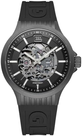 This timepiece showcases a sandblasted stainless steel case in gunmetal. Its skeletonized dial takes center stage, adorned with hands and indices featuring Swiss Super-LumiNova. The appealing design is accentuated by a sporty silicone strap with GLOCK lettering. Driven by an automatic movement and rated to 10 ATM water resistance, this watch guarantees consistent accuracy and reliability.