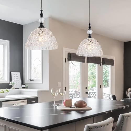 Elegant Kitchen Light Fixture Design: The Modern Black Glass Pendant Light has a clear globe glass shade, which not only allows light to filter through, creating a warm and cozy atmosphere, but also adds a touch of elegance to Kitchen. The stone pattern adds a unique visual interest, making it a focal point on kitchen ceiling.The clear K9 crystal makes the kitchen lighting more luxury
