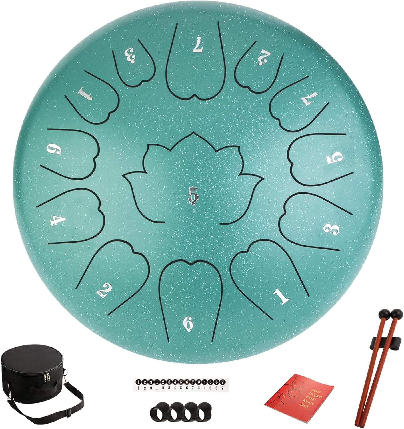Steel Tongue Drum - 12-Inch 13-Notes Tongue Drum, D Major Outdoor Rain Drum With Tote Bag, Music Book, and Hand-Held Drumsticks (Green)
