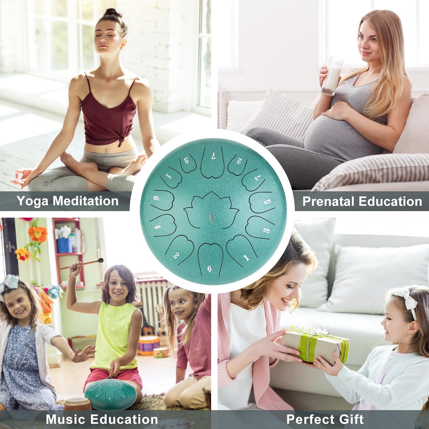 Wide range of applications: Tongue drums are suitable for adult and children's music education, yoga, concert accompaniment, psychotherapy and stress reduction, but also can be used as a rain drum, and the natural rainfall resonance, when the rain hit the tongue drum, it will emit a pleasant sound, so that you listen to the symphony of nature!
