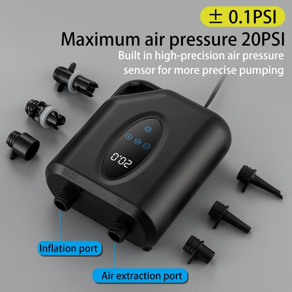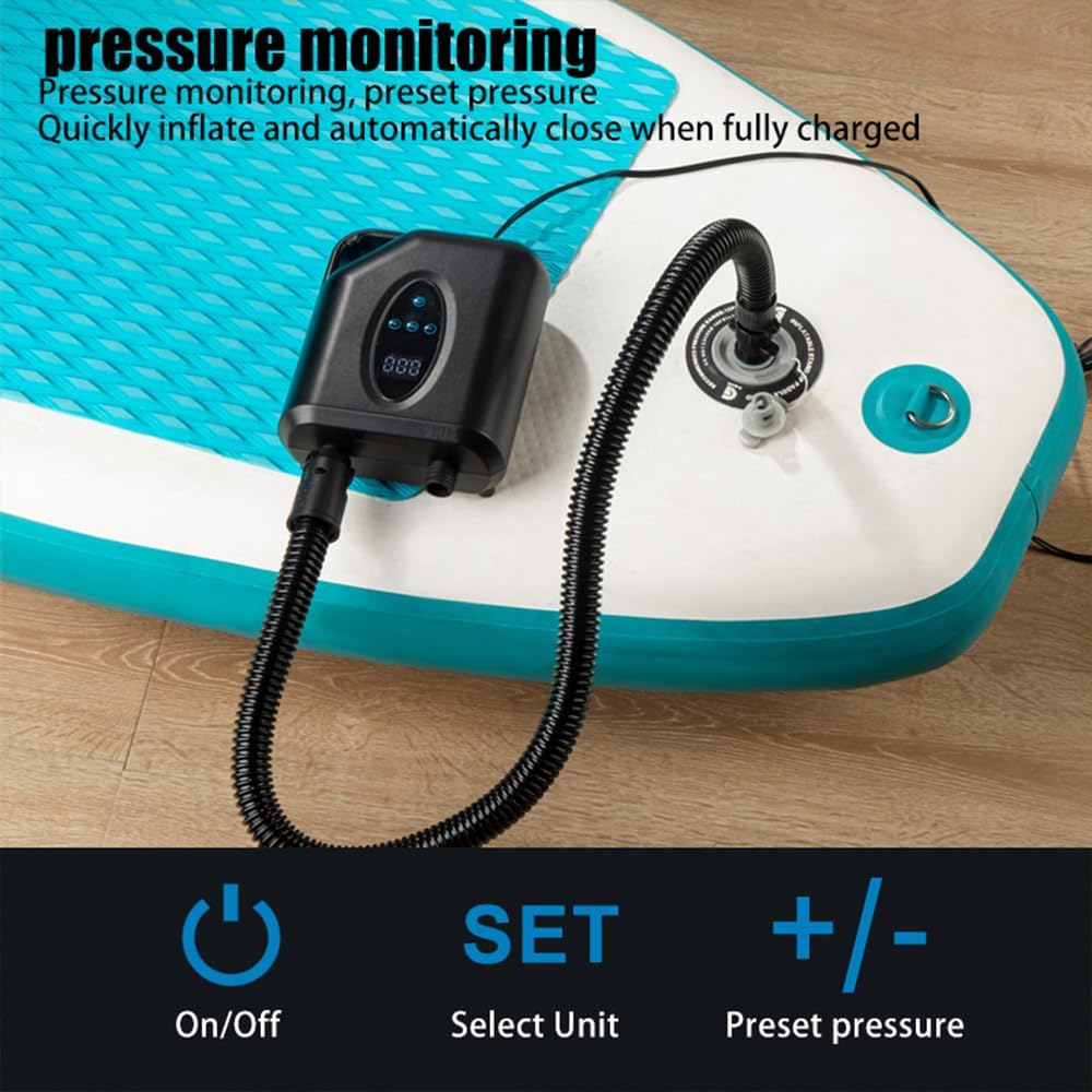 Auto Shut-Off Function : Built in programmed intelligent digital controller for dual stage inflation. You can monitor the real time pressure reading and set the PSI target pressure required by the inflatable product. The sup electric pump will automatically stop inflating when the pressure exceeds the preset pressure value. Equipped with a differential barometer, it maintains a reading error within ±0.1 PSI.