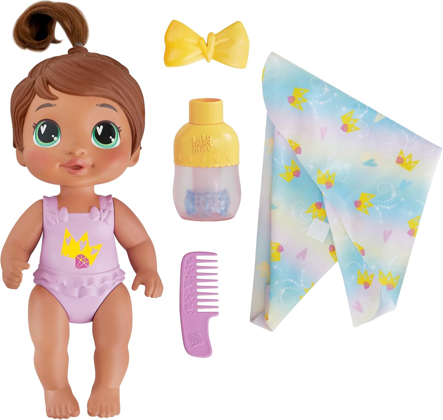 Sophia Sparkle can't wait for her first shampoo with the Shampoo Snuggle baby doll playset! Her shampoo bottle accessory has fun disappearing bubbles and features 3 ways to play: on its own, with water, or with your own kids shampoo. She has a tuft of brushable hair on top of her head and an adorable built-in bathing suit that makes her perfect for water play. Wrap her in her towel with fasteners for extra snuggle, then style her hair tuft with the comb and removable bow. With so much water fun on the way, this adorable companion makes a great baby doll toy for girls & boys 3 years and up. Baby Alive and all related properties are trademarks of Hasbro.