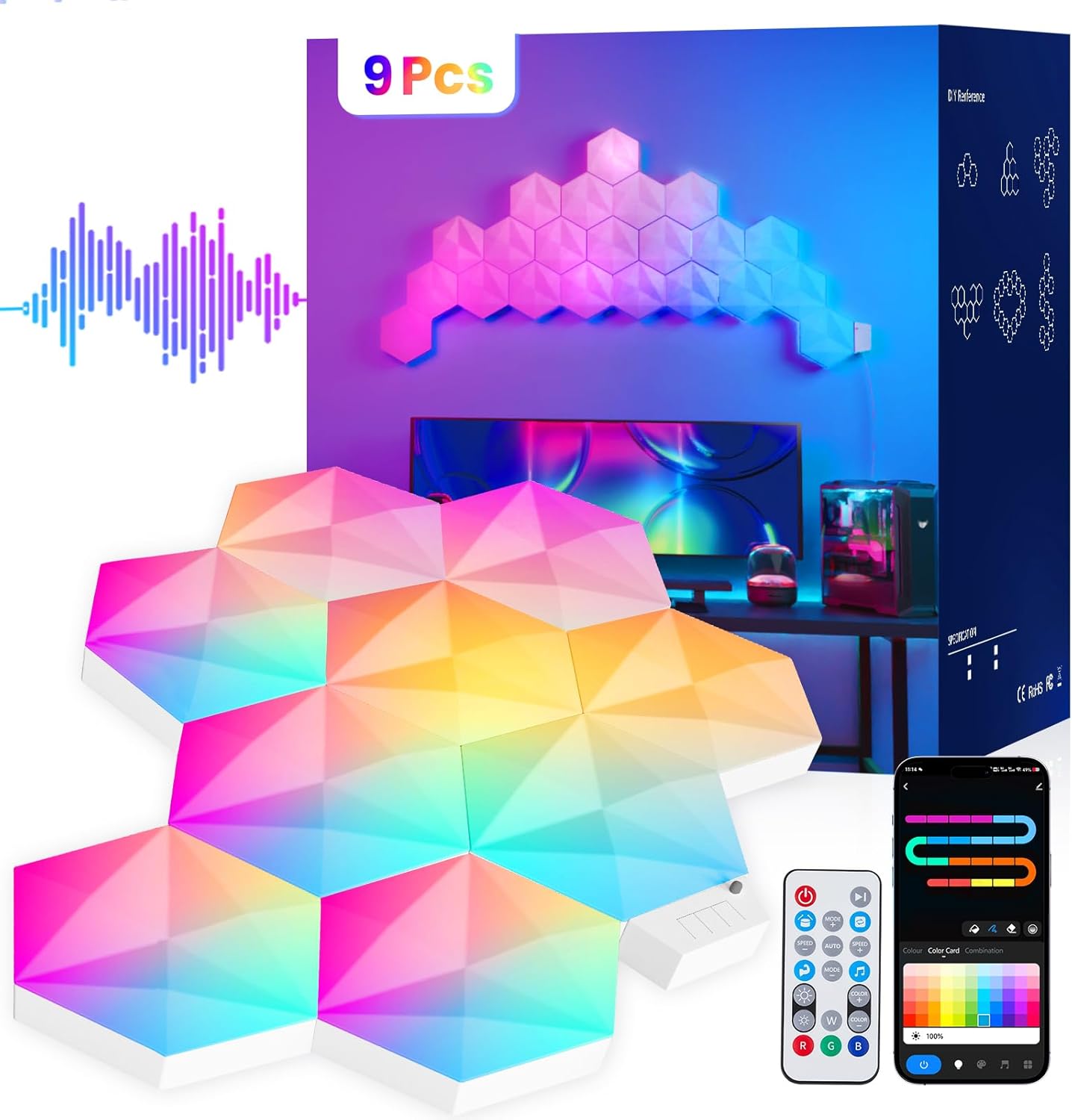 Upgraded RGB+IC Hexagon LED Lights, Glide Hex Light Panels, Smart Modular Hex Tiles, Gaming Decor DIY Wall Lighting, for Christmas Decor, with Music Sync, Remote APP Control, Voice Control(9 Pack)