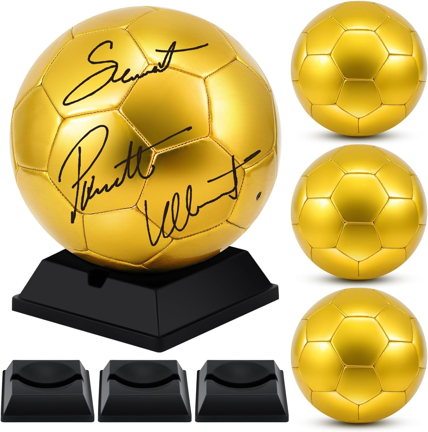 Features: The design of our soccer aims to ensure good performance and control. The materials adopted provide the balls with strength and durability, ensuring they will last for years to come. These balls make winning display pieces. You can place them in your sports room, office, or present them as a gift to a sports enthusiast. Specifications: Ball material: PVCBall color: golden Size: Ball: size 2Pump: approx. 30 cm/ 11.81 inchesBall holder: approx. 4.33 x 4.33 x 1.18 inches/ 11 x 11 x 3 cmPackage includes: 4 x Soccer balls 1 x Pump with needle4 x Ball holders Warm notes: The pump is included, and the ball is deflated when you receive, please inflate it before use. It is recommended to use an oil based signature pen when signing, and do not touch the signature until the writing is completely dry. Please note the size detail information before ordering. Manual measurement, please allow slight errors on size. The color may exist a slight difference due to different screen displays.