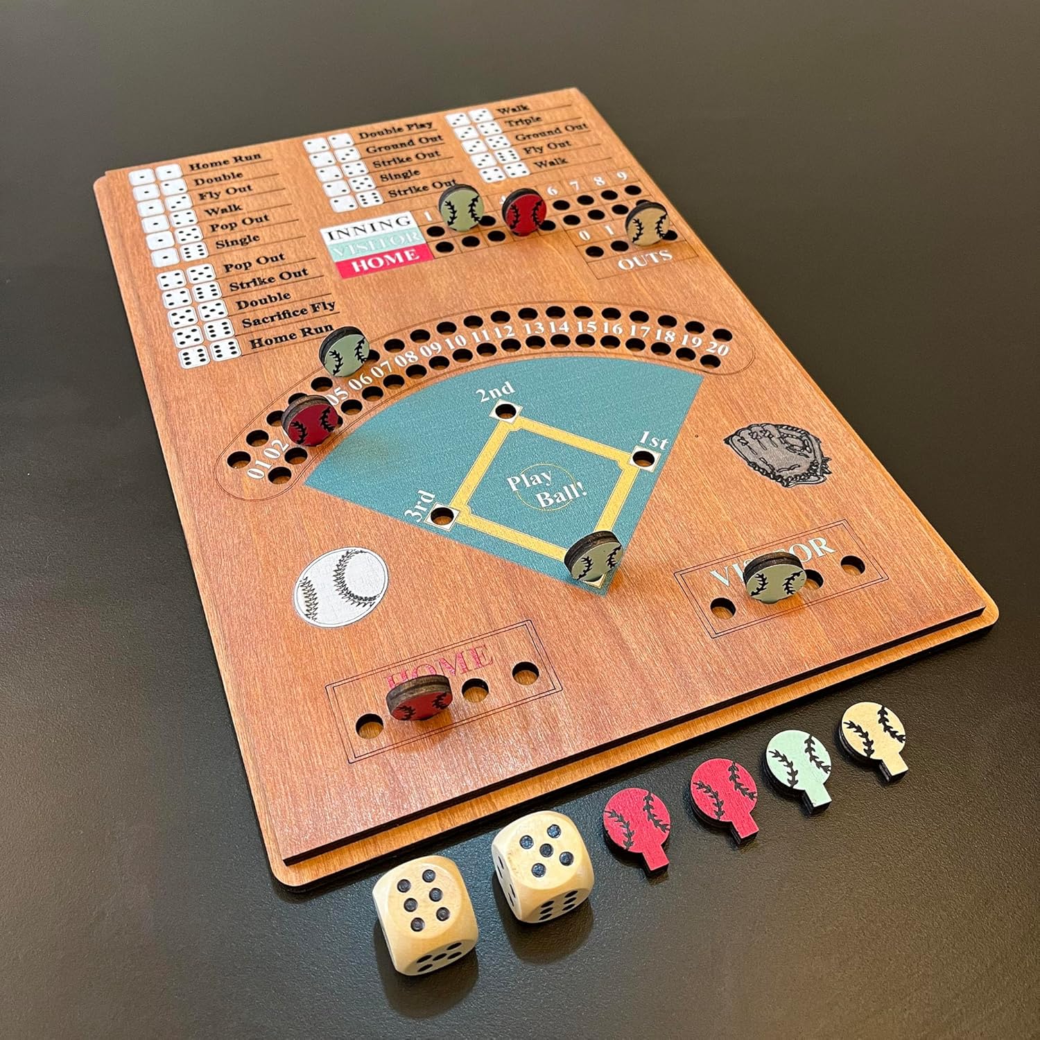 This baseball dice board game field size:12.0inches(H)*8.5inches(W).The game information is engraved on the wooden surface.Home and Visitor with different color,when open it,you wanna play baseball board game immediately.