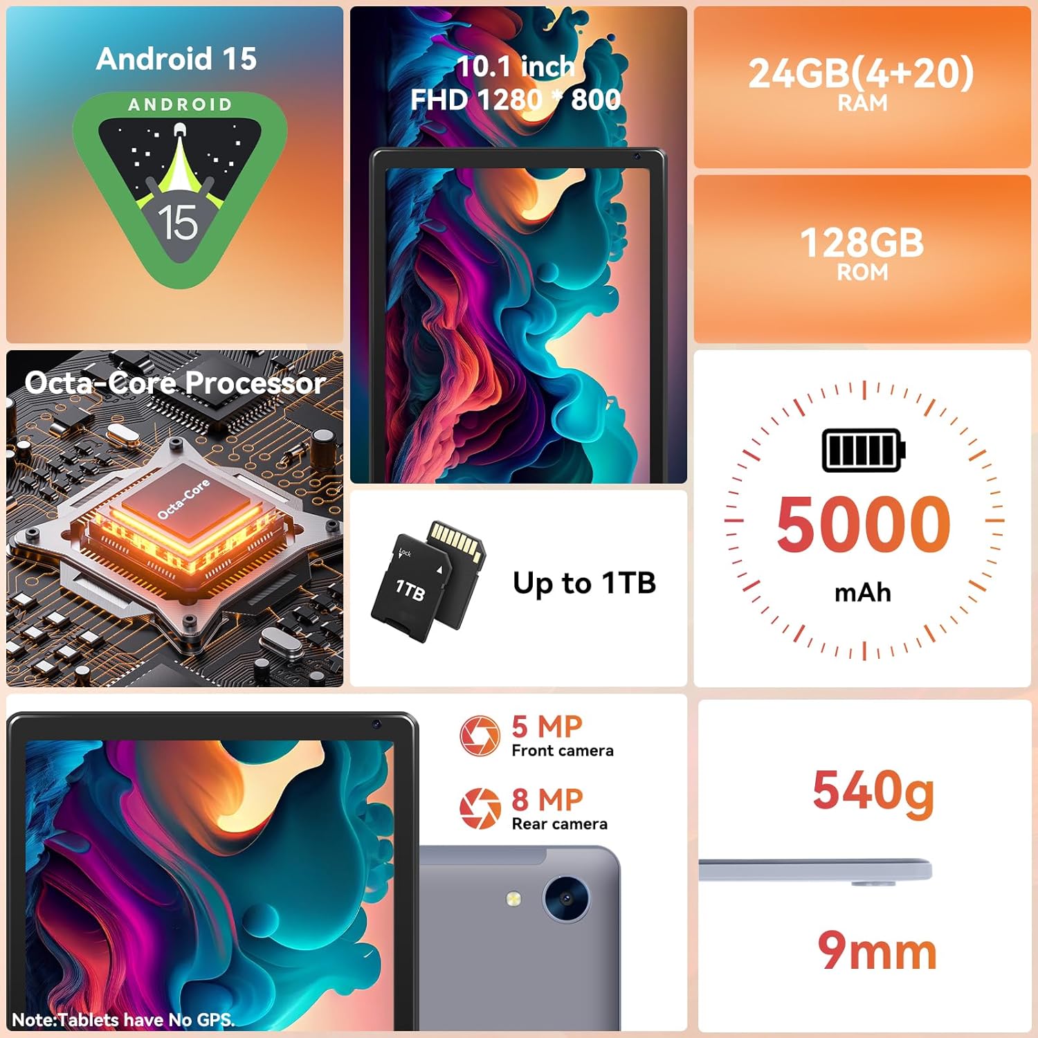 Tableta,10.1" Tableta Android con Procesador Octa-core 24GB RAM 128GB ROM Pantalla táctil HD IPS de 8H de batería, Wi-Fi 6, BT 5.0, Cámara Dual, Android 15 Tablets 2025