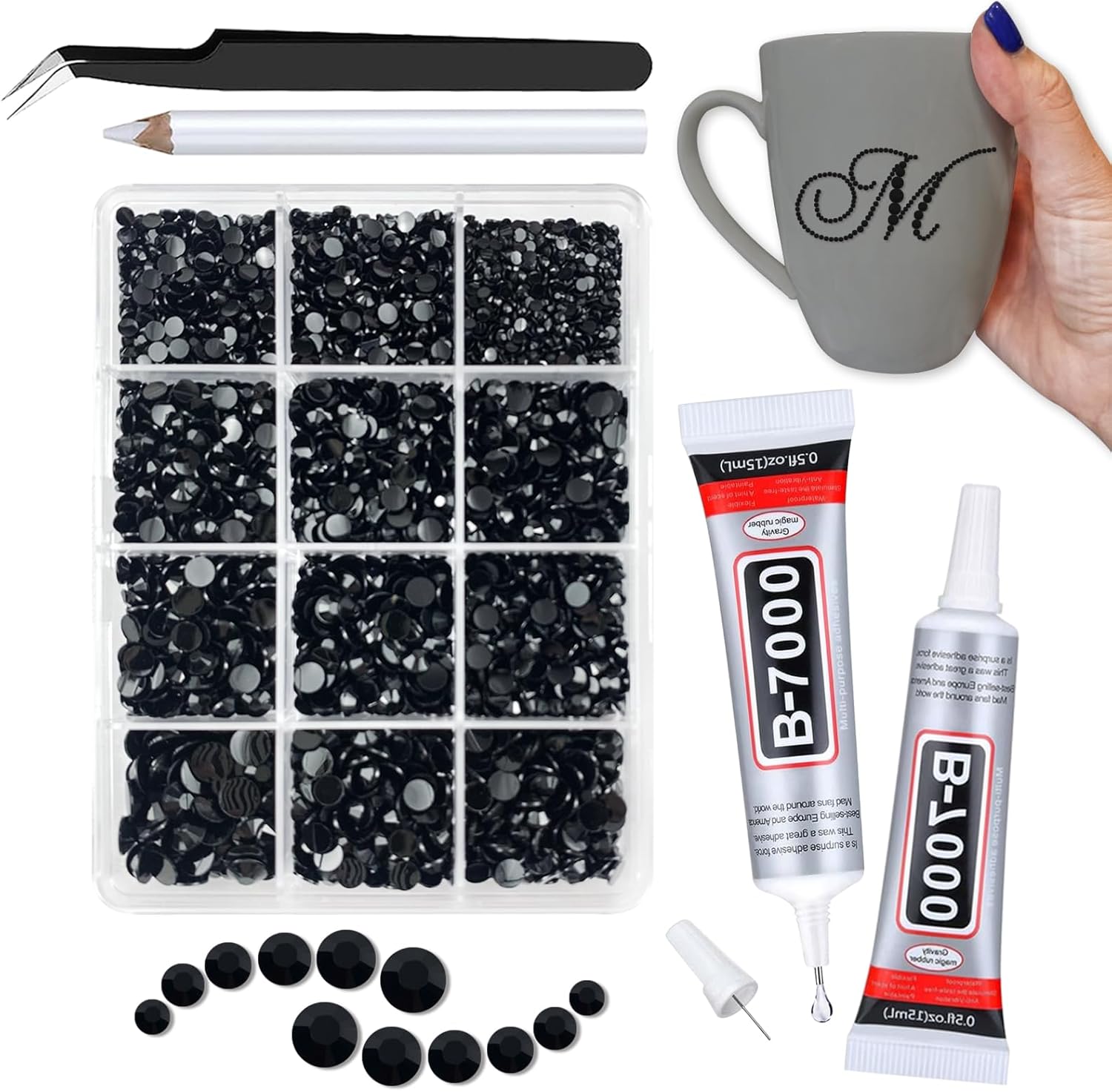Bling Rhinestones Glue Kit for Crafts: B7000 Clear Glue Gemstones Set for Clothes Shoes Jewels - Flatback Diamond for Tumblers - Resin Gems Stones for Nails (Solid Black)