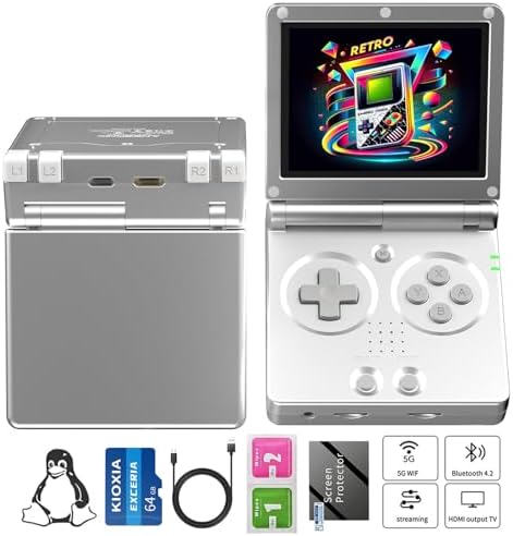 【5G WIFI y Bluetooth 4.2 y Salida de TV HD】El RG35XXSP flip incorpora una tarjeta TF de 64G. La consola de juego portátil es compatible con el controlador inalámbrico de 2.4G y el controlador por cable. También puedes conectarlo al televisor y transferir el juego al televisor para una mejor experiencia de juego.