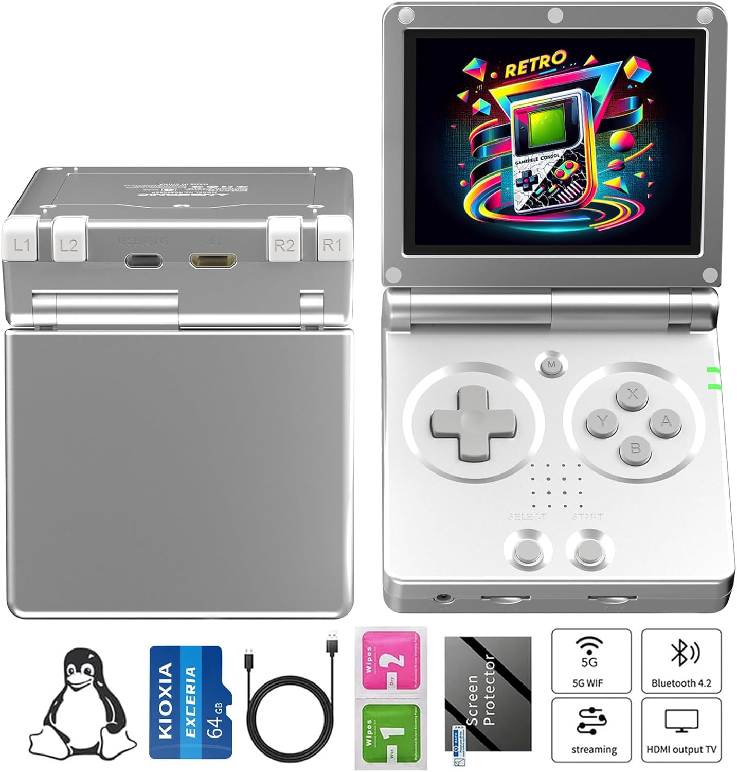 RG35XXSP Consola de Juego Portátil RG35XX SP Consola de Juego Retro de Plegado con Tarjeta TF de 64G Precargada Juegos 5532 Consola de Juego Portátil con Pantalla de 3.5 Pulgadas Batería de 3300mAh 5G WiFi Bluetooth HD Plata