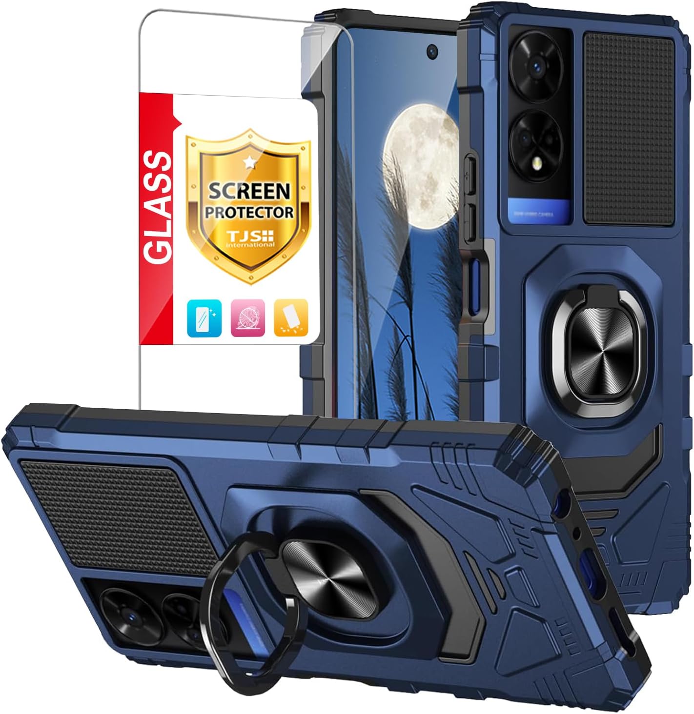 TJS Compatible for TCL 50 XE 5G (T614SP) Case, TCL 50 XE NXTPAPER 5G (T614WS) Case, with Tempered Glass Screen Protector, Metal Ring Magnetic Support Kickstand Phone Case for TCL 50XE (Blue)