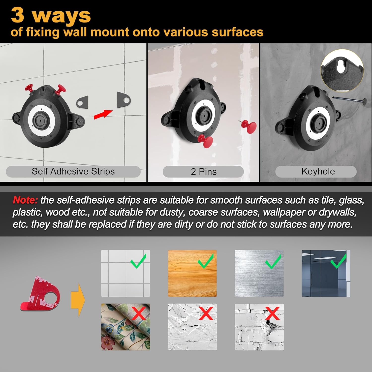 Three Fixing Methods for Multi-Surfaces: The 360° rotating wall mount offers flexible positioning and hands-free marking. Three Fixing Methods: 2 pins for rough surfaces; 6 self-adhesive strips for smooth surfaces (not suitable for dusty, coarse, wallpapered, or drywall surfaces); top pin hole for hard surfaces and other general use