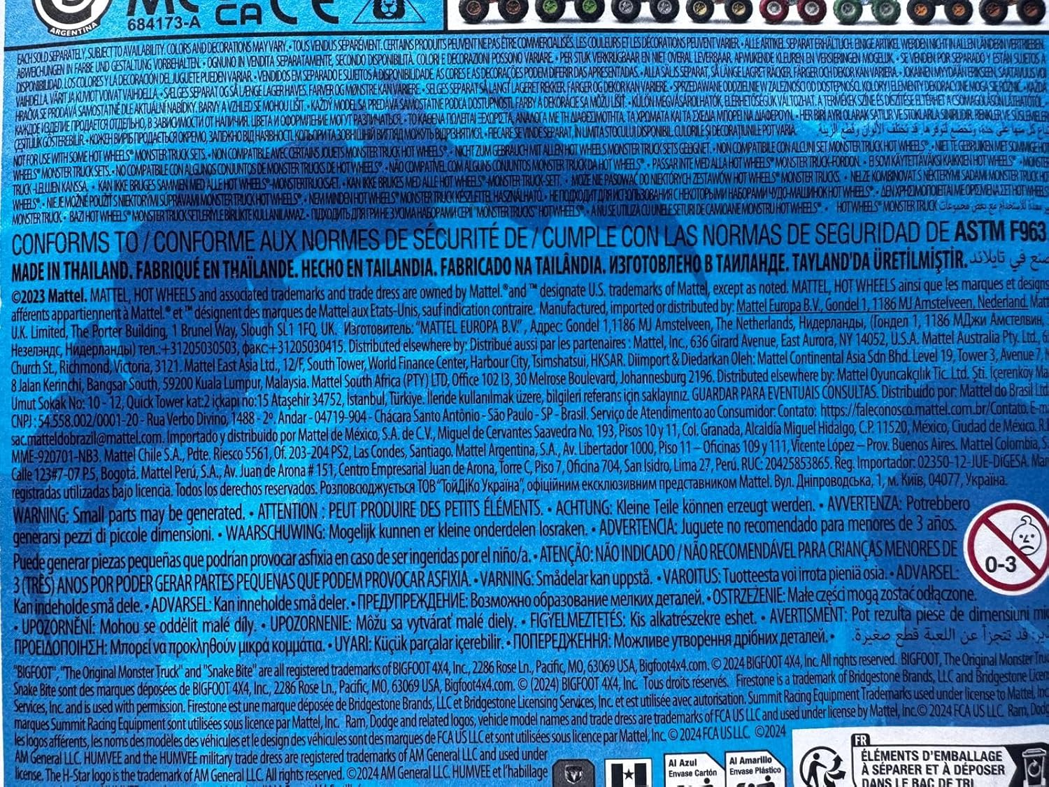 The Hot Wheels Monster Trucks 1:64 scale die-cast vehicles are kid-tested and approved with outrageous chassis designs and giant tires. There is an amazing variety in this collection of die-cast metal toy trucks that are sure to be real crowd pleasers! Giant premium wheels make a statement about the over-the-top creatures, entertaiment characters and Hot Wheels originals that amp up an experience of crashing and smashing fun or collecting to display. Every truck includes a connect-and-crash car, and cool packaging provides stats for each including name, truck type, strength, unique crash attack and motor-vation for great storytelling fun! Hot Wheels 2024 Monster Trucks. Die-Cast Metal Body.