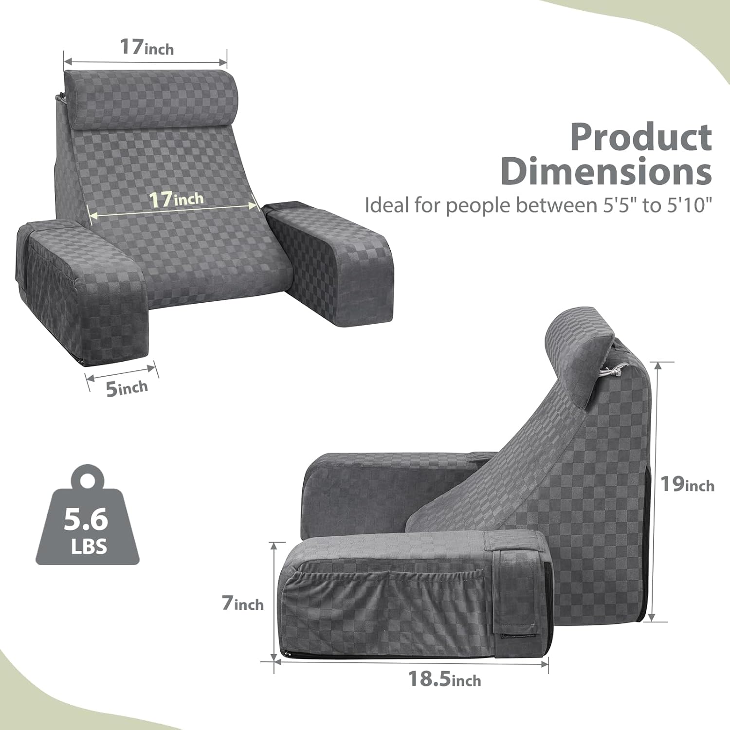Vekkia Reading Pillow with Adjustable Arms & Headrest – Multi-Firm Foam Backrest Cushion for Adults with Extra-Large Pockets for Reading, TV, Gaming & Work, Recovery on Bed & Floor, 19"(Grey)