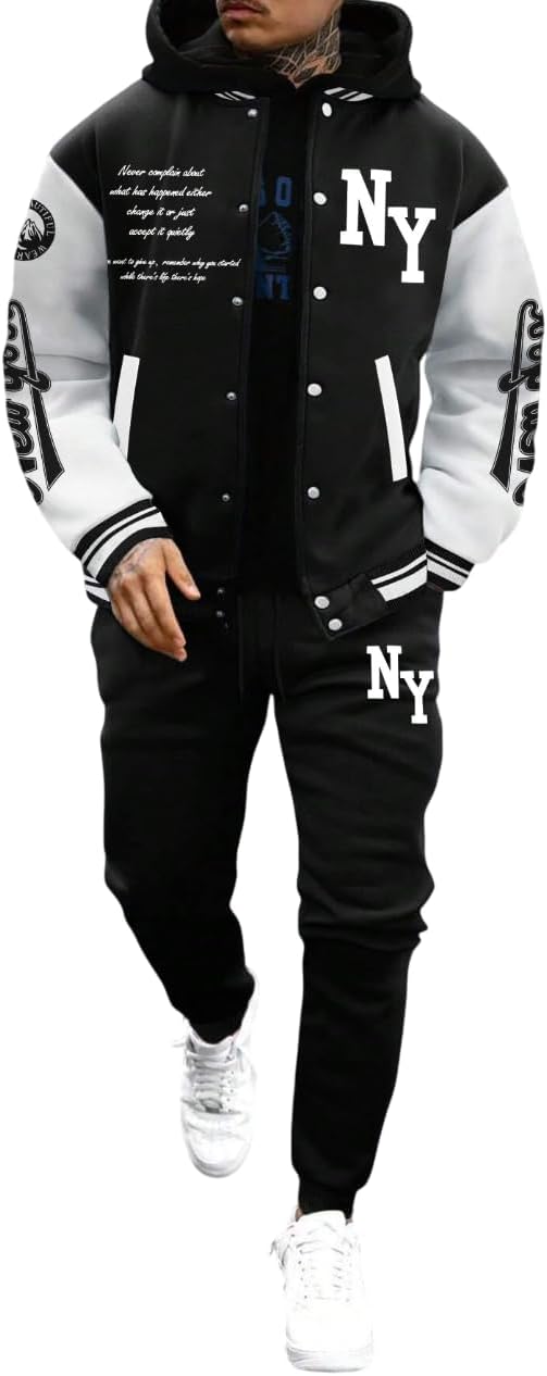 SOLY HUX Men's Tracksuit 2 Piece Outfits Color Block Letter Graphic Long Sleeve Varsity Jacket and Pants Set