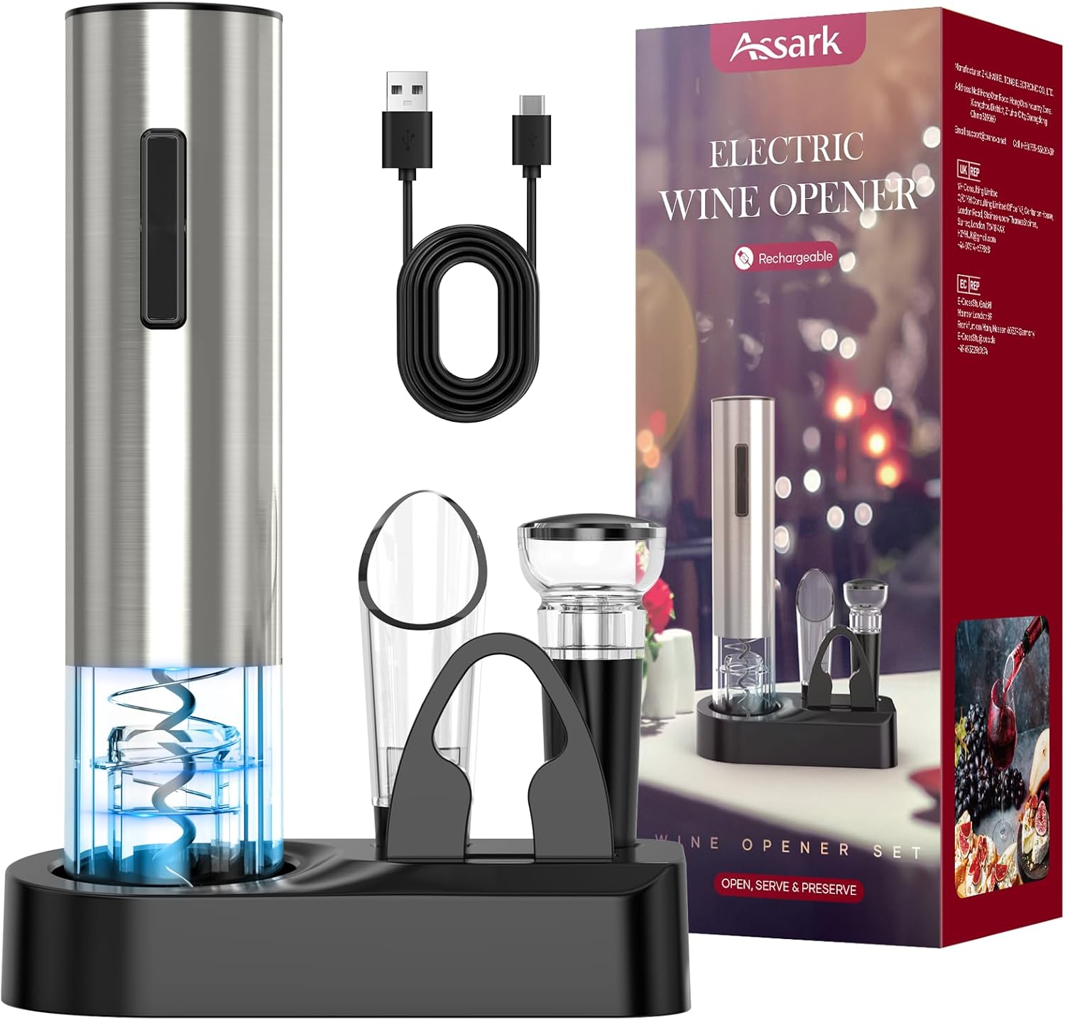Electric Wine Opener,Automatic Wine Bottle Opener Rechargeable Cordless Electric Corkscrew Wine Opener Gift Set with Wine Stopper, Foil Cutter, Wine Aerator,Storage Base & Charging Cable