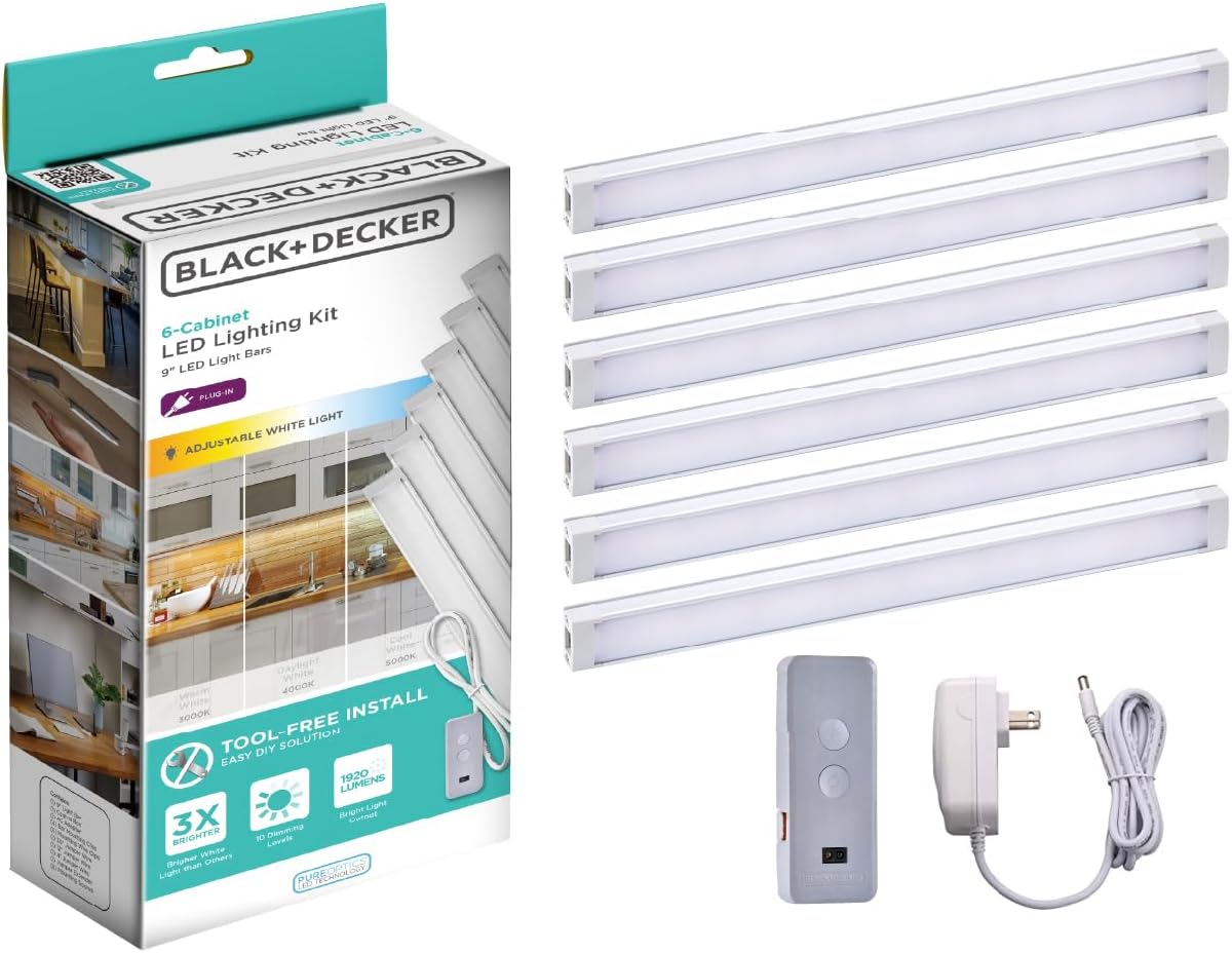 Effortlessly brighten your space with this BLACK+DECKER® PureOptics™ Tool-Free 6-Cabinet LED Lighting Kit, which offers a full range of adjustable white light for an expansive, brilliant glow. Great for areas large or small, easily link up to six ultra-thin 9” light bars under cabinets, counters, islands, shelves, and any other place in your home in need of a little illumination; just one bar brightens spaces up to 36 inches wide! Conveniently included in this ready-to-install kit are various-sized jumper wires, which provide additional flexibility to cover longer distances or specialty configurations, such as jumping a stove. Installation is as easy as 1-2-3 with no tools required to achieve a clean and professional look. Adjust the light mode to suit your mood or task at hand by cycling through ten dimmer settings and three white temperatures, lending the perfect glow complete with a flicker-free fade-out and no hot spots. For convenience and speed, wave your hand below the motion sensor of the control box to turn the light on or off. With cost-efficient LEDs, use 85% less energy for brilliant illumination lasting 50,000 hours. Conserve energy with crisp, high-contrast light for vivid, brilliant colors so you can work, play, and create with unparalleled clarity.