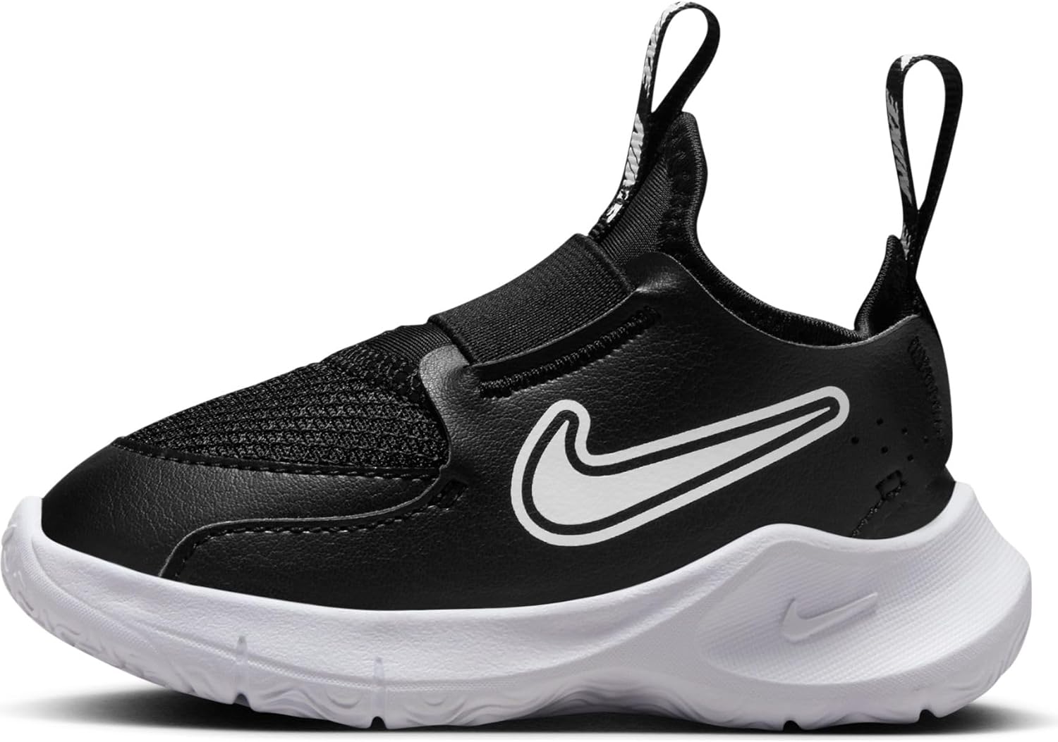 Nike Flex Runner 3 shoe for babies and toddlers. A slip-on design for small winds. Who's ready to play? With the Nike Flex Runner 2, children will find their way from the house to the playground, no matter what the day brings. It has no laces! This means it can be put on and taken off super quickly. The straps and inner shoe design ensure a snug fit. Easy to put on and take off. Thanks to the elastic inner shoe design, the foot easily slides into the shoe. The result is a snug, secure fit. The metatarsal strap, heel strap and leather on the sides stabilise the fit. Stable running feeling. The back of the shoe provides extra stability when moving in different directions with foam that creates a wing-like shape around the heel. The flexible foam sole with notches provides a natural feel with every step. The pattern of the sole provides traction on different surfaces. Take them with you. This special edition has been developed by little adventurers for all little adventurers. The graphics and logos have been remastered by budding artists to give them a hand-painted look. The flexible foam sole with notches provides a natural feel with every step. The pattern of the sole provides traction on different surfaces. The breathable mesh on the front of the shoe is lightweight and keeps feet pleasantly cool. The toe tip is reinforced for extra durability. Pull tabs on the heel and tab make it easy to put on and take off the shoe.