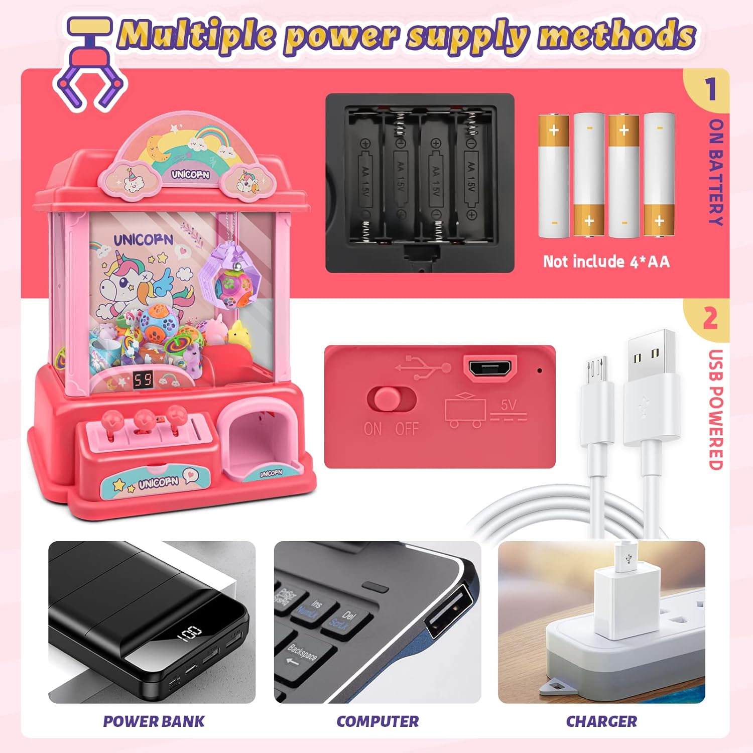 【Tamaño y Modos de Alimentación Dual】:10.8 x 9.44 x 12.59 pulgadas, la máquina de garras eléctrica para niños es suficiente para contener una variedad de premios emocionantes. Gran máquina de garras vending para niños que ofrece dos modos de alimentación: recargable por USB y alimentado por batería (requiere 4 pilas AA, no incluidas!!!).