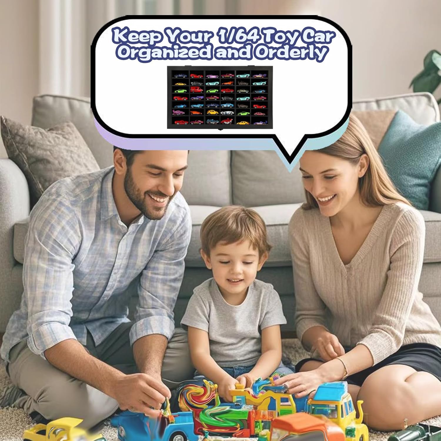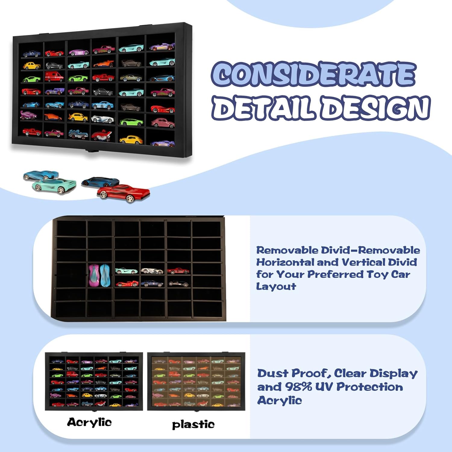 Acrylic Glass - Dustproof, 92% Transparency acrylic glass door, which clearly displays your toy cars and 98% UV protection to protect your collections from yellowing.The door has a black latch to easily open or close the door.