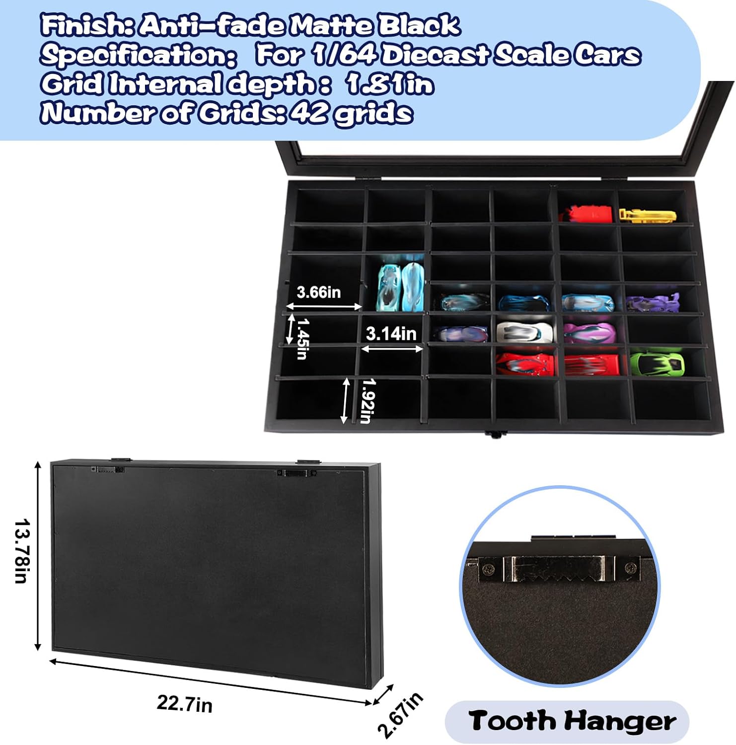 Detachable Partition - Black removable shelf rack provides spacious space for various 1/64 model cars and larger categories of trains, trucks, etc. Both vertical and horizontal shelves are detachable, and you can display toy cars in your preferred way. A total of up to 42 toy cars can be stored.The spacing between shelves is 3.14", the depth is 1.81", and the height between shelves is 1.45".