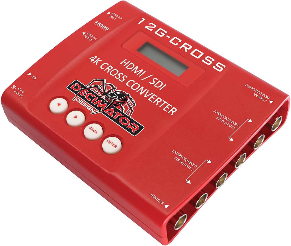 Decimator 12G-CROSS The 12G-CROSS is a small, 11 x 13 x 3 cm, portable converter with low power consumption, housed in a robust aluminium housing and dispenses with a loud fan. It can be used in almost any environment. The 12G-CROSS features a user-friendly LCD screen and button control. This allows easy access to the outstanding features without having to use complicated LED/button control, DIP switches or take a computer with you to change a setting. Features: • Allows simultaneous output of HDMI or SDI from either HDMI or SDI input or the new 4K scaling module • The 4K scaling module can be controlled via either the SDI or HDMI input, supports horizontal and/or vertical mirroring and can be connected to the SDI, HDMI or Genlock input. • The 4K scale module can scale between the following 57 formats and/or convert frame rates: • (3840 or 4096) x 2160p50/59.94/60 via HDMI or 12G-SDI • (3840 or 4096) x 2160p30/29.97/25/24/23.98 via HDMI or 6G-SDI • (1920 or 2048) x 1080p50/59.94/60 via HDMI or 3G-SDI (Level A or B) • 1920 x 1080i60/59.94/50 via HDMI or HD-SDI • (1920 or 2048) x 1080p30/29.97/25/24/23.98 via HDMI or HD-SDI • (1920 or 2048) x 1080psf30/29.97/25/24/23.98 via HD-SDI • 1280 x 720p60/59.94/50/30/29.97/25 via HDMI or HD-SDI • 1280 x 720p24/23.98 via HD-SDI • 720 x 480p59.94 or 720 x 576p50 via HDMI • 720 x 480i59.94 (NTSC) or 720 x 576 (PAL) via HDMI or SD-SDI • These are 3249 possible format conversions! • The audio pairs in the SDI and HDMI outputs can be rearranged as needed. • Includes four 3G/HD/SD SDI outputs that allow for use as a distribution amplifier Package includes: • Decimator 12G-CROSS • USB port for control and firmware updates • Power supply socket with thread lock. • Power supply and USB cable