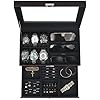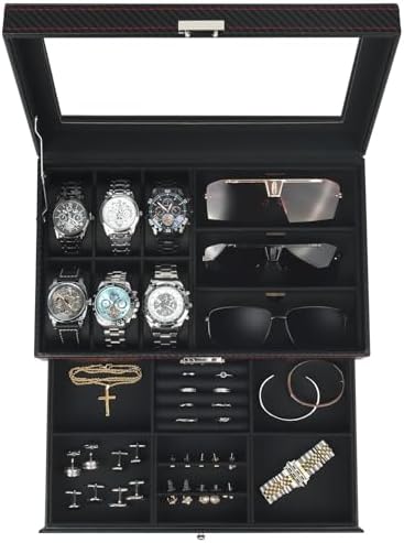 Ideal Size with Spacious Design: Measuring 13.1" L x 7.8" W x 5.1" H, this watch case provides ample storage with 6 dedicated watch slots, 3 sunglass sections and a spacious second drawer for jewelry such as tie pins, cufflinks, earrings, rings and bracelets. The mens jewelry box offers generous space to keep everything in perfect order, enhancing your daily routine.
